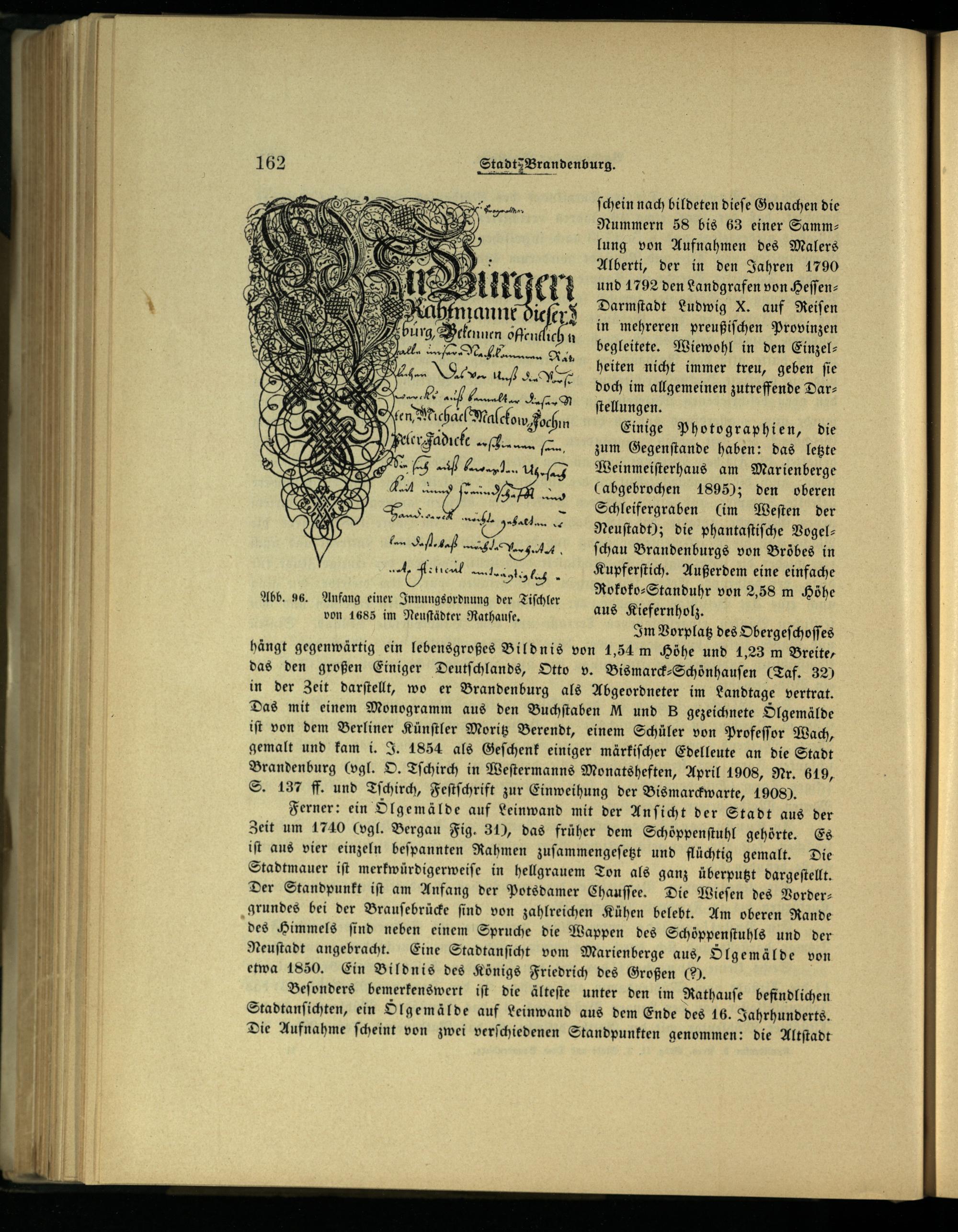 Ferner: ein Slgemälde auf Leinwand mit der Anſicht der Stadt aus der Zeit um 1740(vgl. Bergau Fig. 31), das früher dem Schöppenſtuhl gehörte. Es iſt aus vier einzeln beſpannten Rahmen zuſammengeſetzt und flüchtig gemalt. Die Stadtmauer iſt merkwürdigerweiſe in hellgrauem Ton als ganz überputzt dargeſtellt. Der Standpunkt iſt am Anfang der Potsdamer Chauſſee. Die Wieſen des Vordergrundes bei der Brauſebrücke ſind von zahlreichen Kühen belebt. Am oberen Rande des Himmels ſind neben einem Spruche die Wappen des Schöppenſtuhls und der Neuſtadt angebracht. Eine Stadtanſicht vom Marienberge aus, Ölgemälde von etwa 1850. Ein Bildnis des Königs Friedrich des Großen(9.