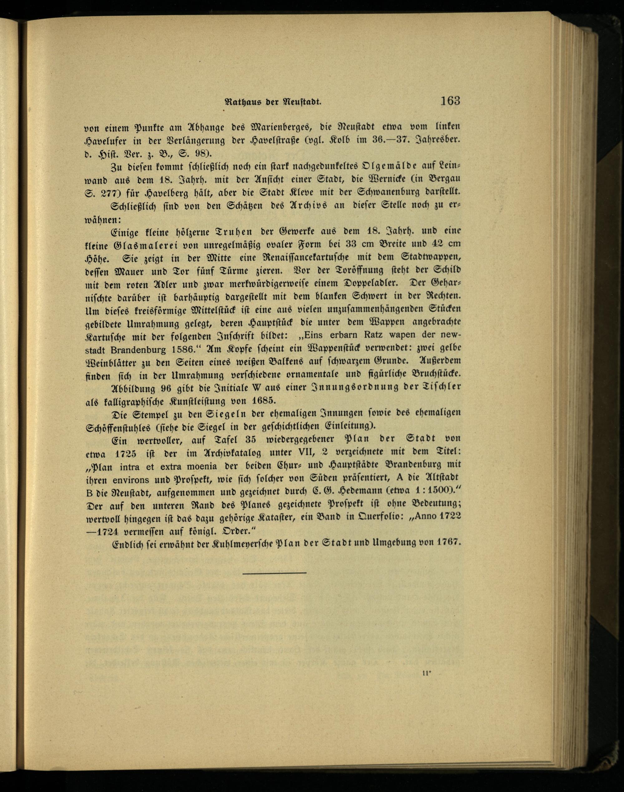 Ein wertvoller, auf Tafel 35 wiedergegebener Plan der Stadt von etwa 1725 iſt der im Archivkatalog unter Vll, 2 verzeichnete mit dem Titel: „Plan intra et extra moenia der beiden Chur - und Hauptſtädte Brandenburg mit ihren environs und Proſpekt, wie ſich ſolcher von Süden präſentiert, A die Altſtadt B die Neuſtadt, aufgenommen und gezeichnet durch C. G. Hedemann(etwa 4: 1500).“ Der auf den unteren Rand des Planes gezeichnete Proſpekt iſt ohne Bedeutung; wertvoll hingegen iſt das dazu gehörige Kataſter, ein Band in Querfolio:„Anno 1722 — 1724 vermeſſen auf königl. Order.“