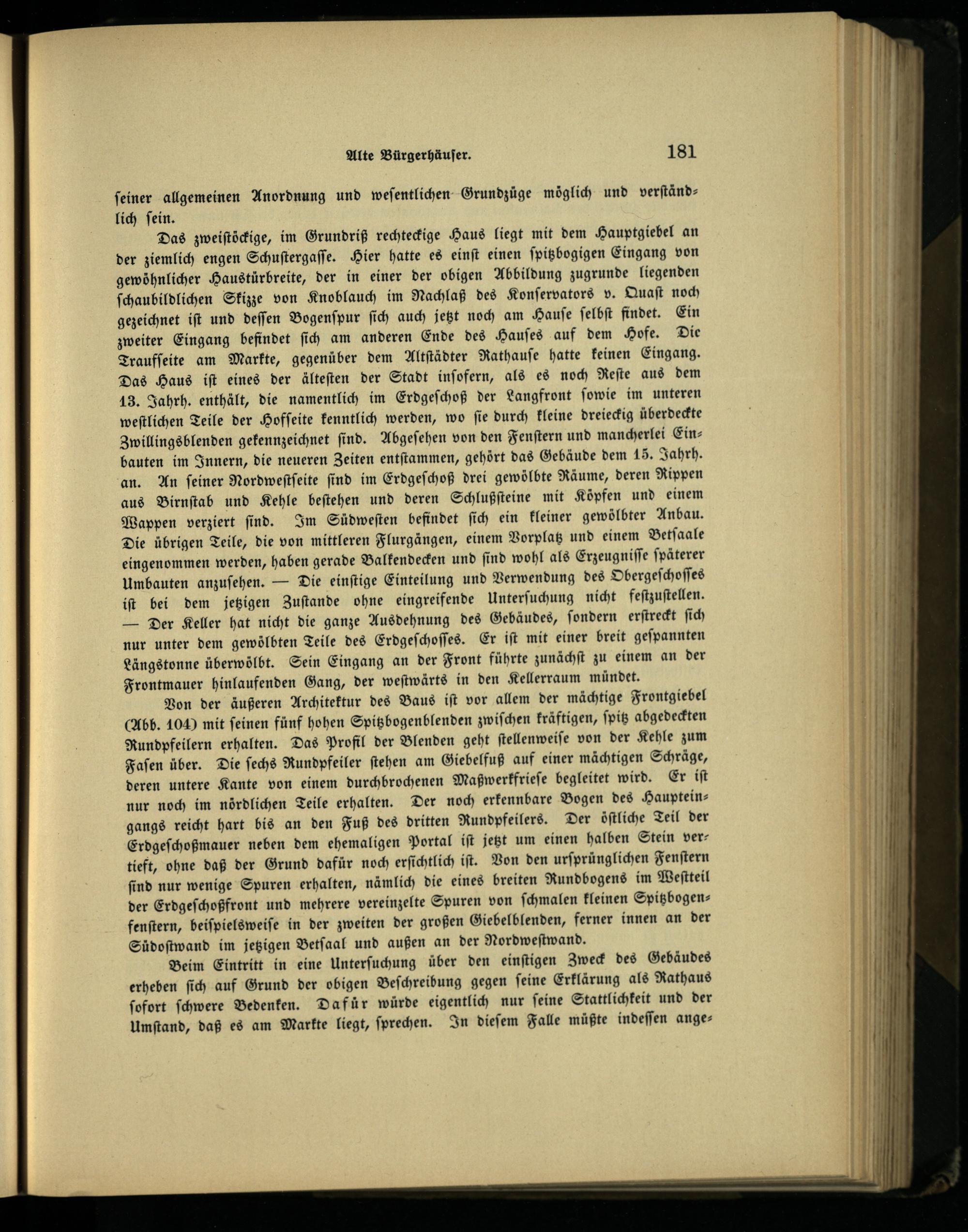 Das zweiſtöckige, im Grundriß rechteckige Haus liegt mit dem Hauptgiebel an der ziemlich engen Schuſtergaſſe. Hier hatte es einſt einen ſpitzbogigen Eingang von gewöhnlicher Haustürbreite, der in einer der obigen Abbildung zugrunde liegenden ſchaubildlichen Skizze von Knoblauch im Nachlaß des Konſervators v. Quaſt noch gezeichnet iſt und deſſen Bogenſpur ſich auch jetzt noch am Hauſe ſelbſt findet. Ein zweiter Eingang befindet ſich am anderen Ende des Hauſes auf dem Hofe. Die Traufſeite am Markte, gegenüber dem Altſtädter Rathauſe hatte keinen Eingang. Das Haus iſt eines der älteſten der Stadt inſofern, als es noch Reſte aus dem 13. Jahrh. enthält, die namentlich im Erdgeſchoß der Langfront ſowie im unteren weſtlichen Teile der Hofſeite kenntlich werden, wo ſie durch kleine dreieckig überdeckte Zwillingsblenden gekennzeichnet find. Abgeſehen von den Fenſtern und mancherlei Einbauten im Innern, die neueren Zeiten entſtammen, gehört das Gebäude dem 15. Jahrh. an. An ſeiner Nordweſtſeite ſind im Erdgeſchoß drei gewölbte Räume, deren Rippen aus Birnſtab und Kehle beſtehen und deren Schlußſteine mit Köpfen und einem Wappen verziert ſind. Im Südweſten befindet ſich ein kleiner gewölbter Anbau. Die übrigen Teile, die von mittleren Flurgängen, einem Vorplatz und einem Betſaale eingenommen werden, haben gerade Balkendecken und ſind wohl als Erzeugniſſe ſpäterer Umbauten anzuſehen.— Die einſtige Einteilung und Verwendung des Obergeſchoſſes iſt bei dem jetzigen Zuſtande ohne eingreifende Unterſuchung nicht feſtzuſtellen. — Der Keller hat nicht die ganze Ausdehnung des Gebäudes, ſondern erſtreckt ſich nur unter dem gewölbten Teile des Erdgeſchoſſes. Er iſt mit einer breit geſpannten Längstonne überwölbt. Sein Eingang an der Front führte zunächſt zu einem an der Frontmauer hinlaufenden Gang, der weſtwärts in den Kellerraum mündet.