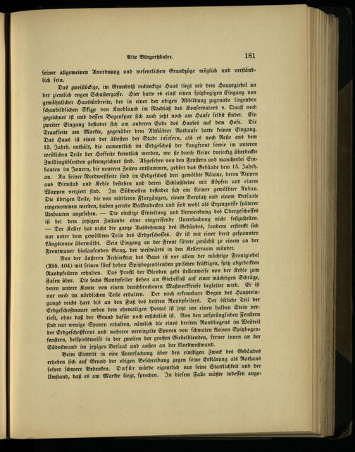 Beim Eintritt in eine Unterſuchung über den einſtigen Zweck des Gebäudes erheben ſich auf Grund der obigen Beſchreibung gegen ſeine Erklärung als Rathaus ſofort ſchwere Bedenken. Dafür würde eigentlich nur ſeine Stattlichkeit und der Umſtand, daß es am Markte liegt, ſprechen. In dieſem Falle müßte indeſſen ange