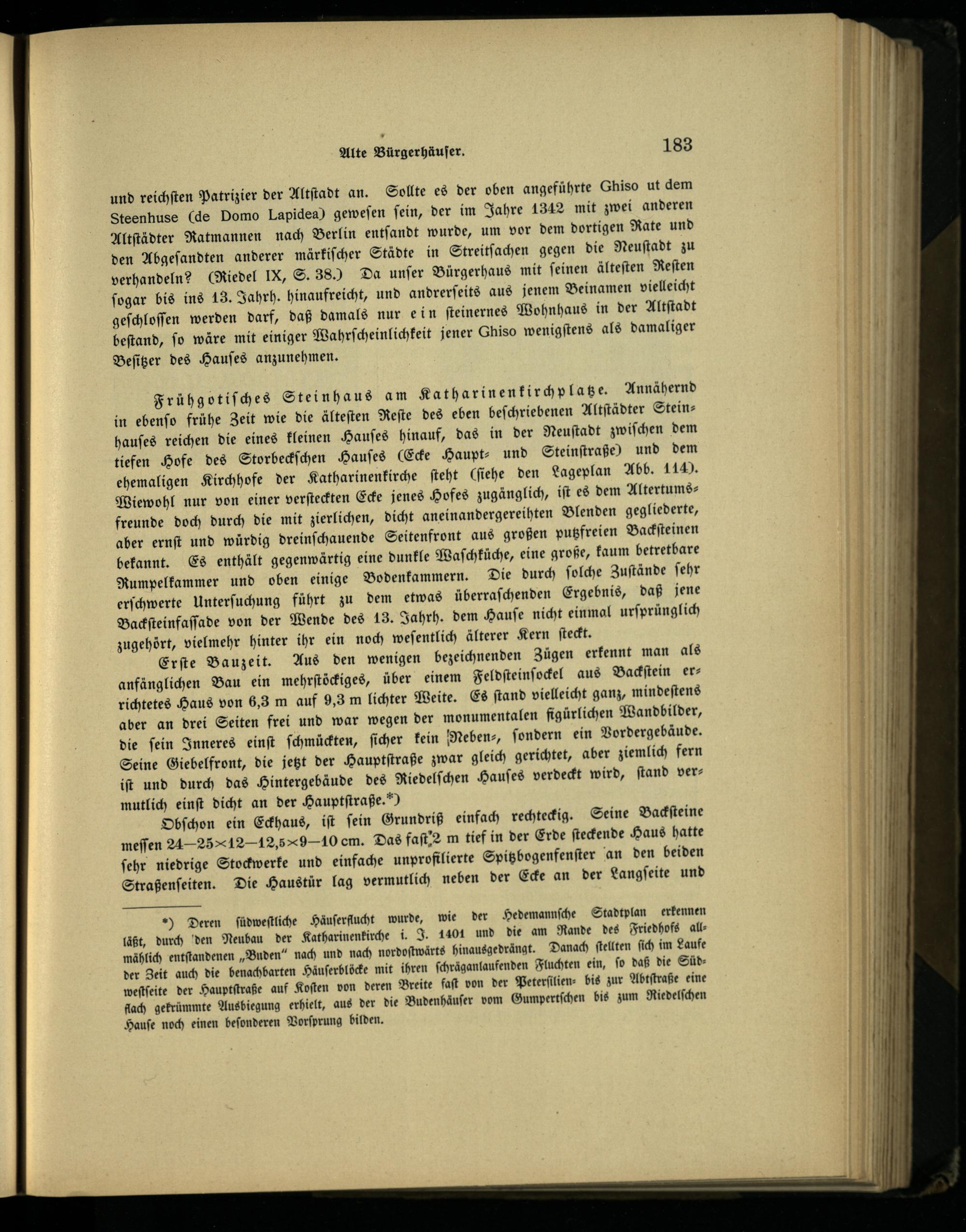 und reichſten Patrizier der Altſtadt an. Sollte es der oben angeführte Ghiso ut dem Steenhuse(de Domo Lapidea) geweſen fein, der im Jahre 1342 mit zwei anderen Altſtädter Ratmannen nach Berlin entſandt wurde, um vor dem dortigen Rate und den Abgeſandten anderer märkiſcher Städte in Streitſachen gegen die Neuſtadt zu verhandeln?(Riedel IX, S. 38.) Da unſer Bürgerhaus mit ſeinen älteſten Reſten ſogar bis ins 13. Jahrh. hinaufreicht, und andrerſeits aus jenem Beinamen vielleicht geſchloſſen werden darf, daß damals nur e in ſteinernes Wohnhaus in der Altſtadt beſtand, ſo wäre mit einiger Wahrſcheinlichkeit jener Ghiso wenigſtens als damaliger Beſitzer des Hauſes anzunehmen.