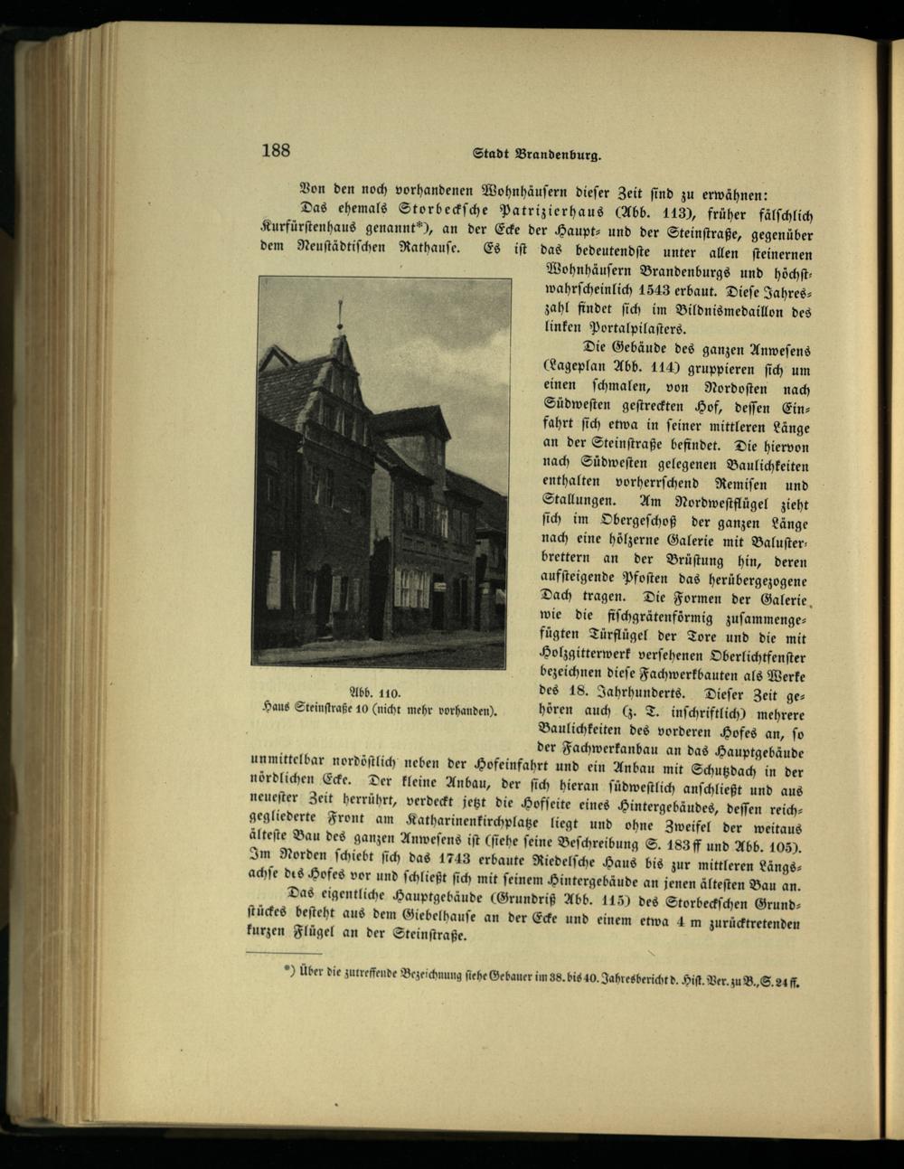 Das ehemals Storbeckſche Patrizierhaus(Abb. 113), früher fälſchlich Kurfürſtenhaus genannt“), an der Ecke der Haupt⸗ und der Steinſtraße, gegenüber dem Neuſtädtiſchen Rathauſe. Es iſt das bedeutendſte unter allen ſteinernen