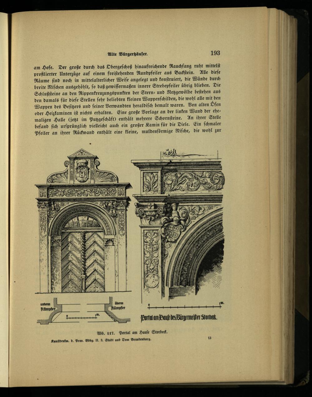 am Hofe. Der große durch das Obergeſchoß hinaufreichende Rauchfang ruht mittelſt profilierter Unterzüge auf einem freiſtehenden Rundpfeiler aus Backſtein. Alle dieſe Räume ſind noch in mittelalterlicher Weiſe angelegt und konſtruiert, die Wände durch breite Niſchen ausgehöhlt, ſo daß gewiſſermaßen innere Strebepfeiler übrig blieben. Die Schlußſteine an den Rippenkreuzungspunkten der Stern: und Netzgewölbe beſtehen aus den damals für dieſe Stellen ſehr beliebten kleinen Wappenſchilden, die wohl alle mit den Wappen des Beſitzers und ſeiner Verwandten heraldiſch bemalt waren. Von alten Sfen oder Heizkaminen iſt nichts erhalten. Eine große Vorlage an der linken Wand der ehemaligen Halle(jetzt im Putzgeſchäft) enthält mehrere Schornſteine. An ihrer Stelle befand ſich urſprünglich vielleicht auch ein großer Kamin für die Diele. Ein ſchmaler Pfeiler an ihrer Rückwand enthält eine kleine, muldenförmige Niſche, die wohl zur