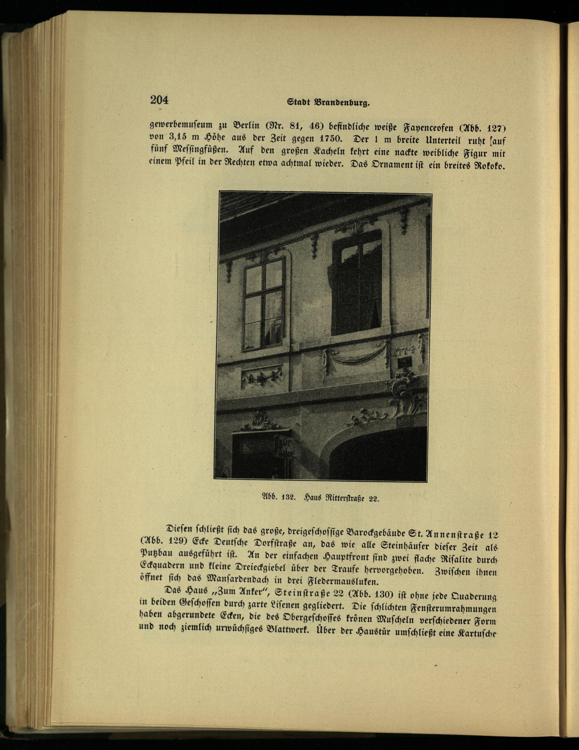Das Haus„Zum Anker“, Steinſtraße 22(Abb. 130 iſt ohne jede Quaderung in beiden Geſchoſſen durch zarte Liſenen gegliedert. Die ſchlichten Fenſterumrahmungen haben abgerundete Ecken, die des Obergeſchoſſes krönen Muſcheln verſchiedener Form und noch ziemlich urwüchſiges Blattwerk. Über der Haustür umſchließt eine Kartuſche