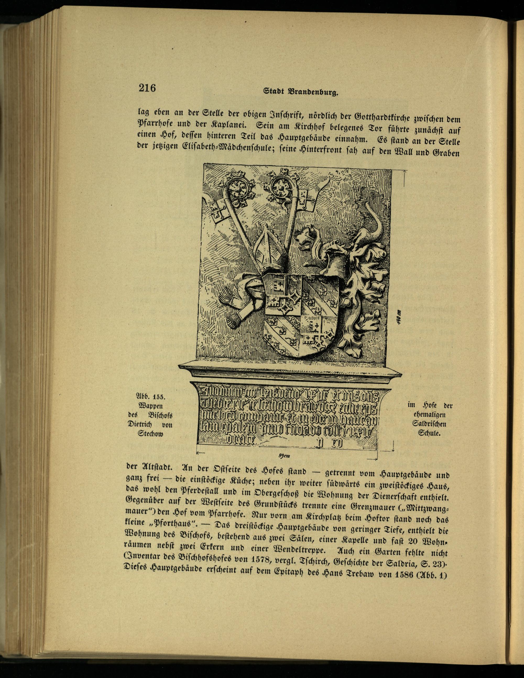 der Altſtadt. An der Oſtſeite des Hofes ſtand— getrennt vom Hauptgebäude und ganz frei— die einſtöckige Küche; neben ihr weiter ſüdwärts ein zweiſtöckiges Haus, das wohl den Pferdeſtall und im Obergeſchoß die Wohnung der Dienerſchaft enthielt. Gegenüber auf der Weſtſeite des Grundſtücks trennte eine Grenzmauer Mittzwangmauer“ den Hof vom Pfarrhofe. Nur vorn am Kirchplatz beim Hoftor ſtand noch das kleine Pforthaus“.— Das dreiſtöckige Hauptgebäude von geringer Tiefe, enthielt die Wohnung des Biſchofs, beſtehend aus zwei Sälen, einer Kapelle und faſt 20 Wohn» räumen nebſt zwei Erkern und einer Wendeltreppe. Auch ein Garten fehlte nicht Inventar des Biſchhofshofes von 1578, vergl. Tſchirch, Geſchichte der Saldria, S. 23). Dieſes Hauptgebäude erſcheint auf dem Epitaph des Hans Trebaw von 1586 Abb. 1)