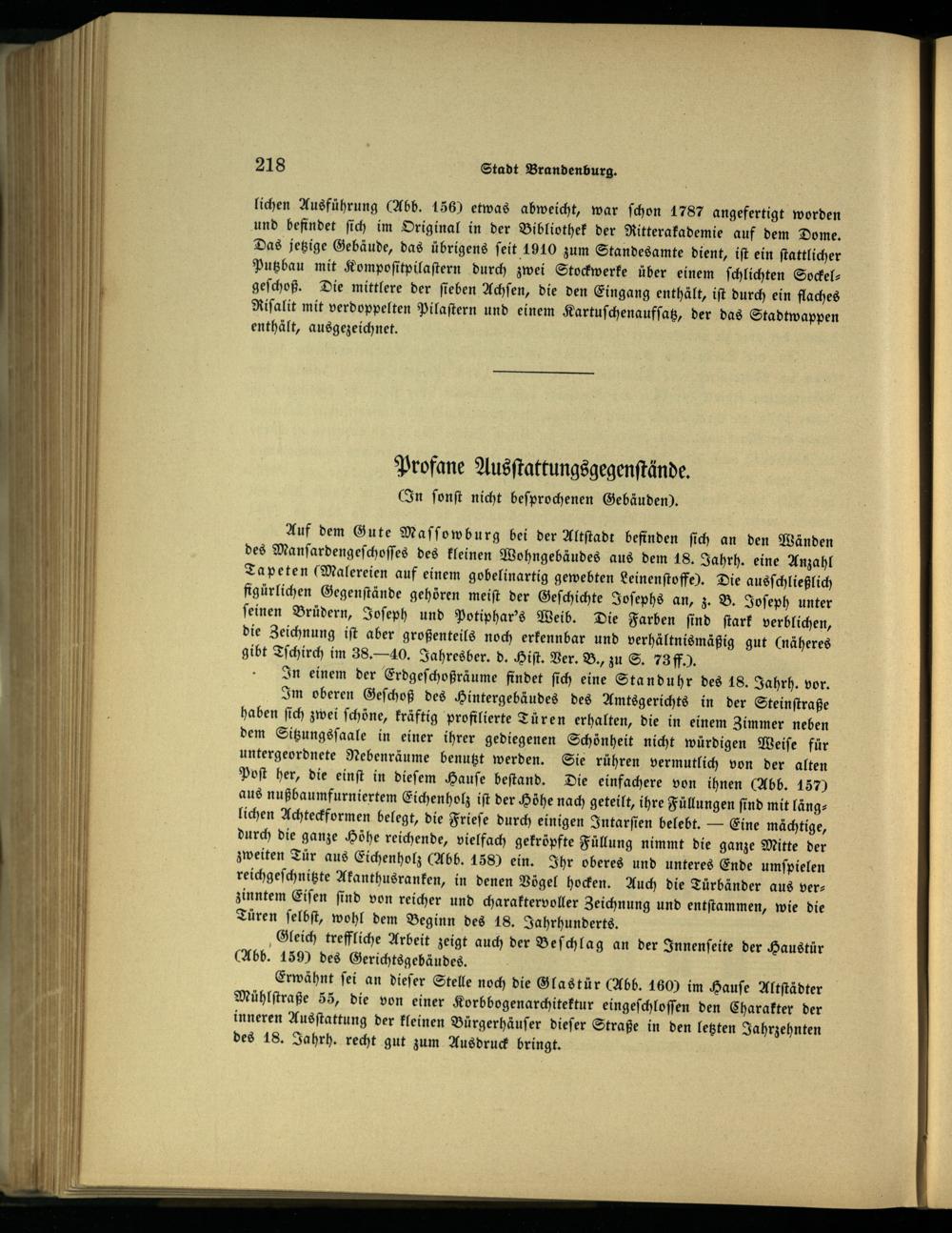 Erwähnt ſei an dieſer Stelle noch die Glastür(Abb. 160) im Hauſe Altſtädter Mühlſtraße 55, die von einer Korbbogenarchitektur eingeſchloſſen den Charakter der inneren Ausſtattung der kleinen Bürgerhäuſer dieſer Straße in den letzten Jahrzehnten des 18. Jahrh. recht gut zum Ausdruck bringt.