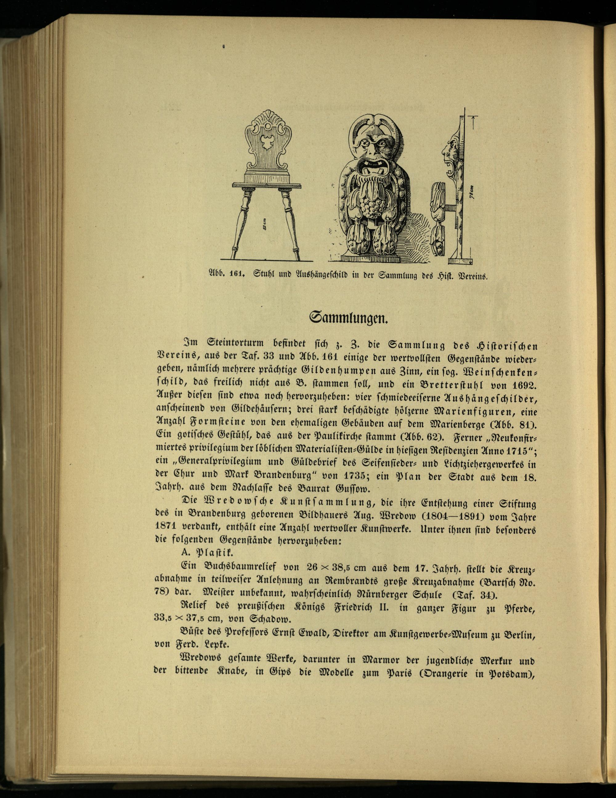 Im Steintorturm befindet sich z. 3. die Sammlung des Historischen Vereins, aus der Taf. 33 und Abb. 161 einige der wertvollsten Gegenstände wiedergeben, nämlich mehrere prächtige Gildenhumpen aus Zinn , ein sog. Weinschenkenschild, das freilich nicht aus B. stammen soll, und ein Bretterstuhl von 1692. Außer diesen sind etwa noch hervorzuheben: vier schmiedeeiserne Aushängeschilder, anscheinend von Gildehäusern; drei stark beschädigte hölzerne Marienfiguren, eine Anzahl Formsteine von den ehemaligen Gebäuden auf dem Marienberge( Abb. 81). Ein gotisches Gestühl, das aus der Paulikirche stammt( Abb. 62). Ferner ,, Neukonfir miertes privilegium der löblichen Materialisten- Gülde in hiesigen Residenzien Anno 1715"; ein ,, Generalprivilegium und Güldebrief des Seifensieder- und Lichtziehergewerkes in der Chur und Mark Brandenburg" von 1735; ein Plan der Stadt aus dem 18. Jahrh. aus dem Nachlasse des Baurat Gussow.
