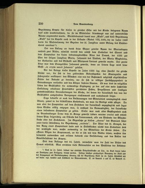 Bezeichnung Krypta für dieſen in gleicher Höhe mit der Kirche belegenen Raum darf nicht wundernehmen, da ſie im Mittelalter keineswegs nur auf unterirdiſche Räume angewendet wurde. Gleichbedeutend damit war„Kluft“, und dieſe Bezeichnung „Kluft“ hat die Kapelle auch in der Urkunde(Riedel VIII, 410), die im Jahre 1440 darin die Wahrnehmung der Gezeiten der hl. Jungfrau unter Geſang des Schüler— chores anordnet).