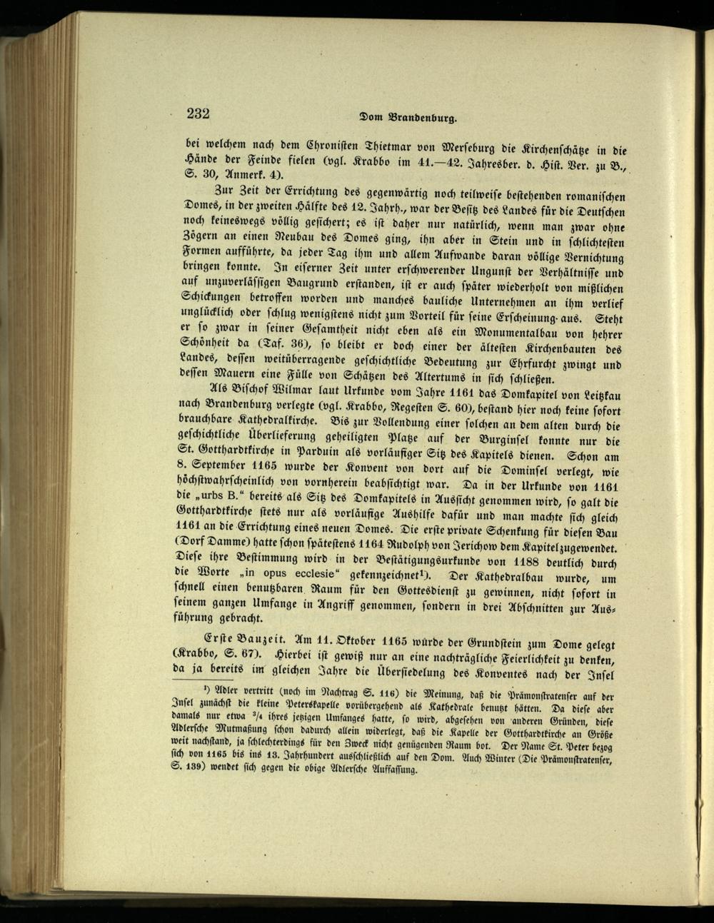 bei welchem nach dem Chroniſten Thietmar von Merſeburg die Kirchenſchätze in die Hände der Feinde fielen(vgl. Krabbo im 41.42. Jahres ber. d. Hiſt. Ver. zu B.,; S. 30, Anmerk. H... Zur Zeit der Errichtung des gegenwärtig noch teilweiſe beſtehenden romaniſchen Domes, in der zweiten Hälfte des 12. Jahrh., war der Beſitz des Landes für die Deutſchen noch keineswegs völlig geſichert; es iſt daher nur natürlich, wenn man zwar ohne Zögern an einen Neubau des Domes ging, ihn aber in Stein und in ſchlichteſten Formen aufführte, da jeder Tag ihm und allem Aufwande daran völlige Vernichtung bringen konnte. In eiſerner Zeit unter erſchwerender Ungunſt der Verhältniſſe und auf unzuverläſſigen Baugrund erſtanden, iſt er auch ſpäter wiederholt von mißlichen Schickungen betroffen worden und manches bauliche Unternehmen an ihm verlief unglücklich oder ſchlug wenigſtens nicht zum Vorteil für ſeine Erſcheinung aus. Steht er ſo zwar in ſeiner Geſamtheit nicht eben als ein Monumentalbau von hehrer Schönheit da(Taf. 36), ſo bleibt er doch einer der älteſten Kirchenbauten des Landes, deſſen weitüberragende geſchichtliche Bedeutung zur Ehrfurcht zwingt und deſſen Mauern eine Fülle von Schätzen des Altertums in ſich ſchließen.