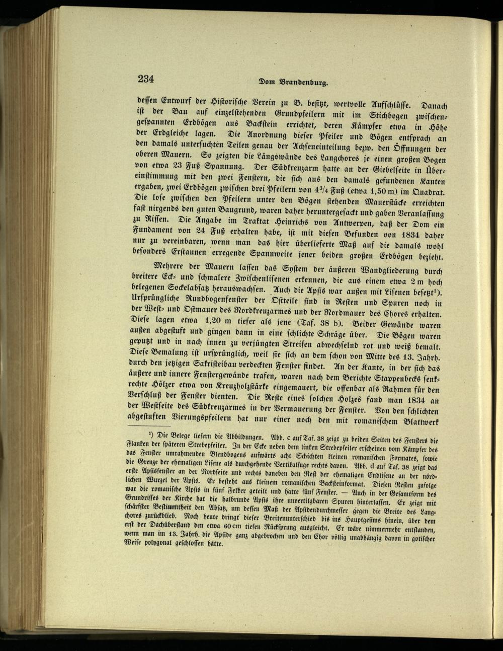 ) Die Belege liefern die Abbildungen. Abb. e auf Taf. 38 zeigt zu beiden Seiten des Fenſters die Flanken der ſpäteren Strebepfeiler. In der Ecke neben dem linken Strebepfeiler erſcheinen vom Kämpfer des das Fenſter umrahmenden Blendbogens aufwärts acht Schichten kleinen romaniſchen Formates, ſowie die Grenze der ehemaligen Liſene als durchgehende Vertikalfuge rechts davon. Abb. d auf Taf. 38 zeigt das erſte Apſisfenſter an der Nordſeite und rechts daneben den Reſt der ehemaligen Endliſene an der nörd—lichen Wurzel der Apſis. Er beſteht aus kleinem romaniſchen Backſteinformat. Dieſen Reſten zufolge war die romaniſche Apſis in fünf Felder geteilt und hatte fünf Fenſter.— Auch in der Geſamtform des Grundriſſes der Kirche hat die halbrunde Apſis ihre unvertilgbaren Spuren hinterlaſſen. Er zeigt mit ſchärfſter Beſtimmtheit den Abſatz, um deſſen Maß der Apſidendurchmeſſer gegen die Breite des Langchores zurückblieb. Noch heute dringt dieſer Breitenunterſchied bis ins Hauptgeſims hinein, über dem erſt der Dachüberſtand den etwa 60 em tiefen Rückſprung ausgleicht. Er wäre nimmermehr entſtanden, wenn man im 13. Jahrh. die Apſide ganz abgebrochen und den Chor völlig unabhängig davon in gotiſcher Weiſe polygonal geſchloſſen hätte.