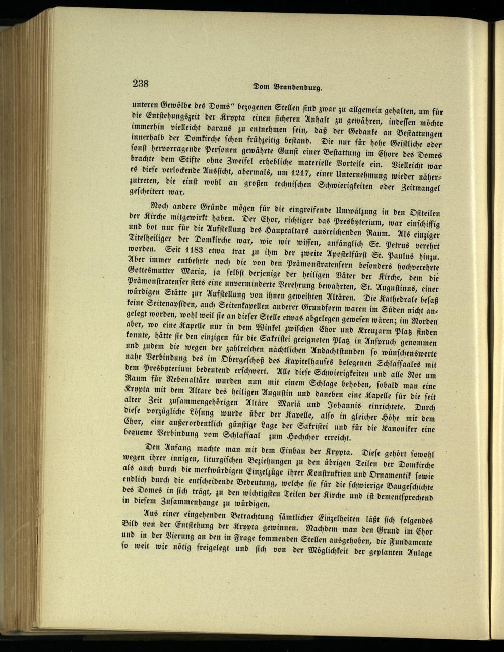 Noch andere Gründe mögen für die eingreifende Umwälzung in den Oſtteilen der Kirche mitgewirkt haben. Der Chor, richtiger das Presbyterium, war einſchiffig und bot nur für die Aufſtellung des Hauptaltars ausreichenden Raum. Als einziger Titelheiliger der Domkirche war, wie wir wiſſen, anfänglich St. Petrus verehrt worden. Seit 1183 etwa trat zu ihm der zweite Apoſtelfürſt St. Paulus hinzu. Aber immer entbehrte noch die von den Prämonſtratenſern beſonders hochverehrte Gottesmutter Maria, ja ſelbſt derjenige der heiligen Väter der Kirche, dem die Prämonſtratenſer ſtets eine unverminderte Verehrung bewahrten, St. Auguſtinus, einer würdigen Stätte zur Aufſtellung von ihnen geweihten Altären. Die Kathedrale beſaß keine Seitenapſiden, auch Seitenkapellen anderer Grundform waren im Süden nicht angelegt worden, wohl weil ſie an dieſer Stelle etwas abgelegen geweſen wären; im Norden aber, wo eine Kapelle nur in dem Winkel zwiſchen Chor und Kreuzarm Platz finden konnte, hätte ſie den einzigen für die Sakriſtei geeigneten Platz in Anſpruch genommen und zudem die wegen der zahlreichen nächtlichen Andachtſtunden ſo wünſchenswerte nahe Verbindung des im Obergeſchoß des Kapitelhauſes belegenen Schlafſaales mit dem Presbyterium bedeutend erſchwert. Alle dieſe Schwierigkeiten und alle Not um Raum für Nebenaltäre wurden nun mit einem Schlage behoben, ſobald man eine Krypta mit dem Altare des heiligen Auguſtin und daneben eine Kapelle für die feit alter Zeit zuſammengehörigen Altäre Mariä und Johannis einrichtete. Durch dieſe vorzügliche Löſung wurde über der Kapelle, alſo in gleicher Höhe mit dem Chor, eine außerordentlich günſtige Lage der Sakriſtei und für die Kanoniker eine bequeme Verbindung vom Schlafſaal zum Hochchor erreicht.