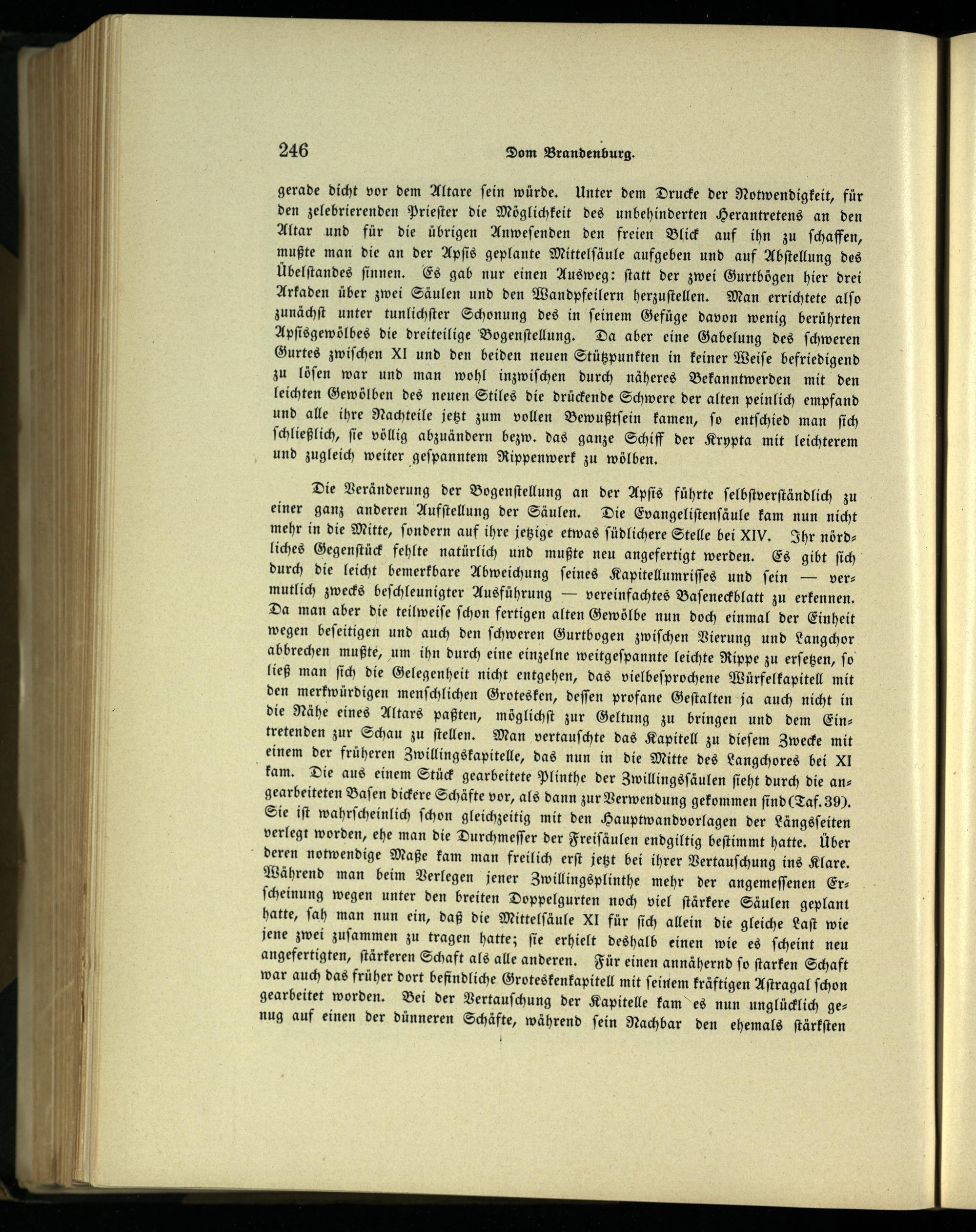gerade dicht vor dem Altare ſein würde. Unter dem Drucke der Notwendigkeit, für den zelebrierenden Prieſter die Möglichkeit des unbehinderten Herantretens an den Altar und für die übrigen Anweſenden den freien Blick auf ihn zu ſchaffen, mußte man die an der Apſis geplante Mittelſäule aufgeben und auf Abſtellung des Übelſtandes ſinnen. Es gab nur einen Ausweg: ſtatt der zwei Gurtbögen hier drei Arkaden über zwei Säulen und den Wandpfeilern herzuſtellen. Man errichtete alſo zunächſt unter tunlichſter Schonung des in ſeinem Gefüge davon wenig berührten Apſisgewölbes die dreiteilige Bogenſtellung. Da aber eine Gabelung des ſchweren Gurtes zwiſchen XI und den beiden neuen Stützpunkten in keiner Weiſe befriedigend zu löſen war und man wohl inzwiſchen durch näheres Bekanntwerden mit den leichten Gewölben des neuen Stiles die drückende Schwere der alten peinlich empfand und alle ihre Nachteile jetzt zum vollen Bewußtſein kamen, ſo entſchied man ſich ſchließlich, ſie völlig abzuändern bezw. das ganze Schiff der Krypta mit leichterem und zugleich weiter geſpanntem Rippenwerk zu wölben.