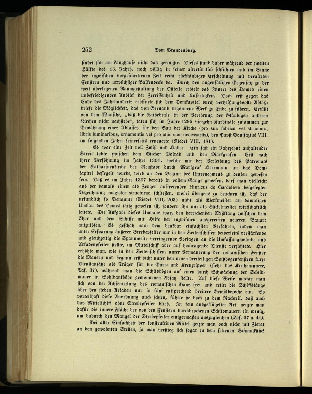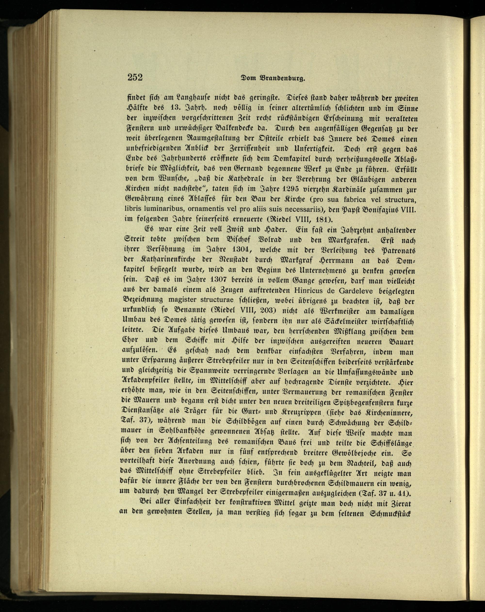 findet ſich am Langhauſe nicht das geringſte. Dieſes ſtand daher während der zweiten Hälfte des 13. Jahrh. noch völlig in ſeiner altertümlich ſchlichten und im Sinne der inzwiſchen vorgeſchrittenen Zeit recht rückſtändigen Erſcheinung mit veralteten Fenſtern und urwüchſiger Balkendecke da. Durch den augenfälligen Gegenſatz zu der weit überlegenen Raumgeſtaltung der Oſtteile erhielt das Innere des Domes einen unbefriedigenden Anblick der Zerriſſenheit und Unfertigkeit. Doch erſt gegen das Ende des Jahrhunderts eröffnete ſich dem Domkapitel durch verheißungsvolle Ablaß — briefe die Möglichkeit, das von Gernand begonnene Werk zu Ende zu führen. Erfüllt von dem Wunſche,„daß die Kathedrale in der Verehrung der Gläubigen anderen Kirchen nicht nachſtehe“, taten ſich im Jahre 1295 vierzehn Kardinäle zuſammen zur Gewährung eines Ablaſſes für den Bau der Kirche(pro sua fabrica vel structura, libris luminaribus, ornamentis vel pro aliis suis necessariis), den Papſt Bonifazius VIII. im folgenden Jahre ſeinerſeits erneuerte(Riedel Vlll, 1863.