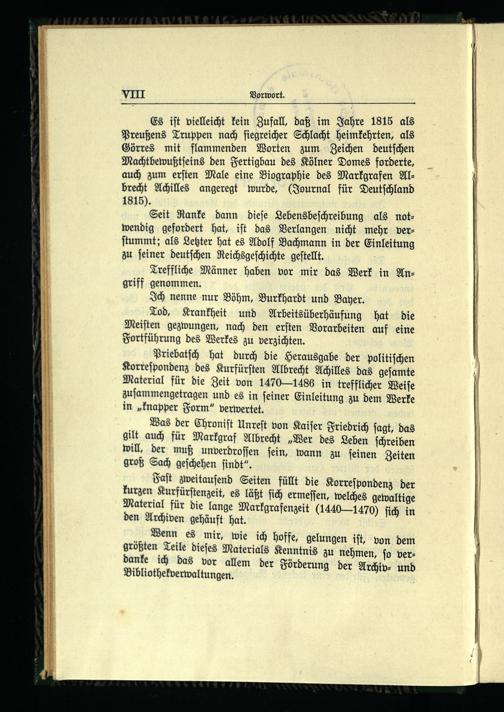 Es iſt vielleicht kein Zufall, daß im Jahre 1815 als Preußens Truppen nach ſiegreicher Schlacht heimkehrten, als Görres mit flammenden Worten zum Zeichen deutſchen Machtbewußtſeins den Fertigbau des Kölner Domes forderte, auch zum erſten Male eine Biographie des Markgrafen Al­ brecht Achilles angeregt wurde,(Journal für Deutſchland 1815).