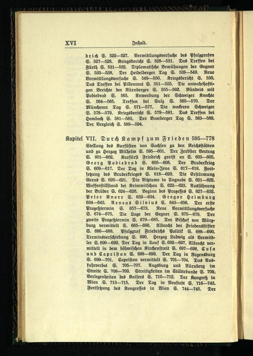 VII. Durch Kampf zum Frieden 595—778 Stellung des Kurfüſten von Sachſen zu den Reichsſtädten und zu Herzog Wilhelm S. 595-601. Der Zerbſter Vertrag S. 601602. Kurfürſt Friedrich greift an S. 603605. Georg Podiebrad S. 605-608. Der Bruderkrieg S. 609617. Der Tag in Klein⸗Jena S. 617618. Fortſetzung des Bruderkrieges S. 618—620. Die Erſtürmung Geras S. 620—621. Die Vitztume in Ungnade S. 621622. Waffenſtillſtand bei Krimmitſchau S. 622—623. Ausſöhnung der Brüder S. 624—626. Beginn des Prozeſſes S. 627632. Peter Knorr S. 632—634. Gregor Heimburg 634—643. Aeneas Silvius S. 643656. Der erſte Prozeßtermin S. 657-673. Neue Vermittlungsverſuche S. 674—675. Die Lage der Gegner S. 675—679. Der zweite Prozeßtermin S. 679—685. Der Biſchof von Würzburg vermittelt S. 685—686. Albrecht der Friedensſtifter S. 686—688. Pfalzgraf Friedrichs Politik S. 688690. Terminsverſchiebung S. 690. Herzog Ludwig als Vermittler S. 690—692. Der Tag in Lauf S. 692—697. Albrecht vermittelt in dem böhmiſchen Kirchenſtreit S. 697-698. Cu ſa und Capriſtan S. 698—699. Der Tag in Regensburg S. 699—701. Capriſtan vermittelt S. 701—704. Das Ausfuhrverbot S. 705—707. Augsburg und Nürnberg im Streite S. 708—709. Streitigkeiten im Städtebunde S. 709. Verlegenheiten des Kaiſers S. 710—712. Der Kongreß in Wien S. 713—715. Der Tag in Neuſtadt S. 716—743. Fortſetzung des Kongreſſes in Wien S. 744745. Der
