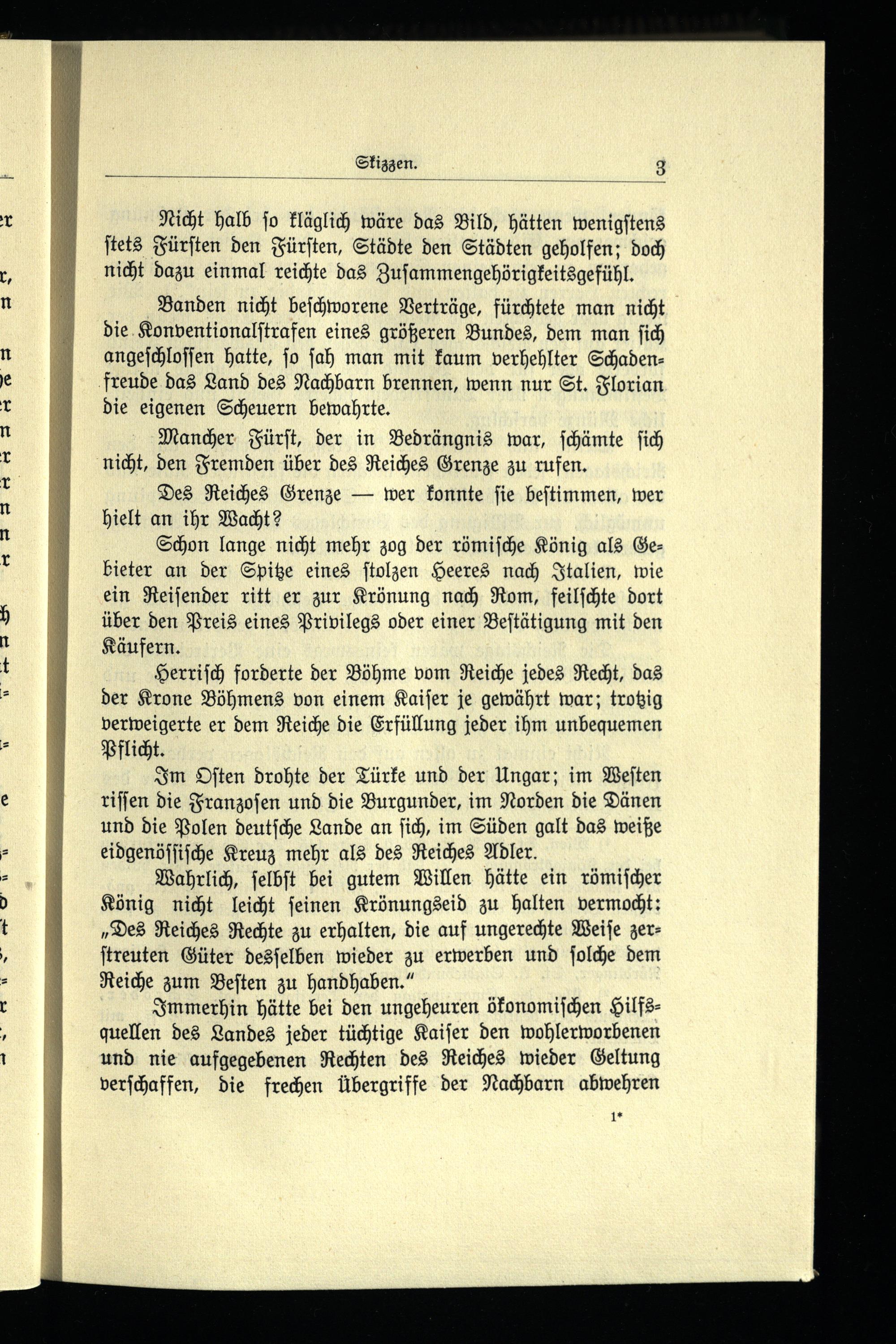 Im Oſten drohte der Türke und der Ungar; im Weſten riſſen die Franzoſen und die Burgunder, im Norden die Dänen und die Polen deutſche Lande an ſich, im Süden galt das weiße eidgenöſſiſche Kreuz mehr als des Reiches Adler.