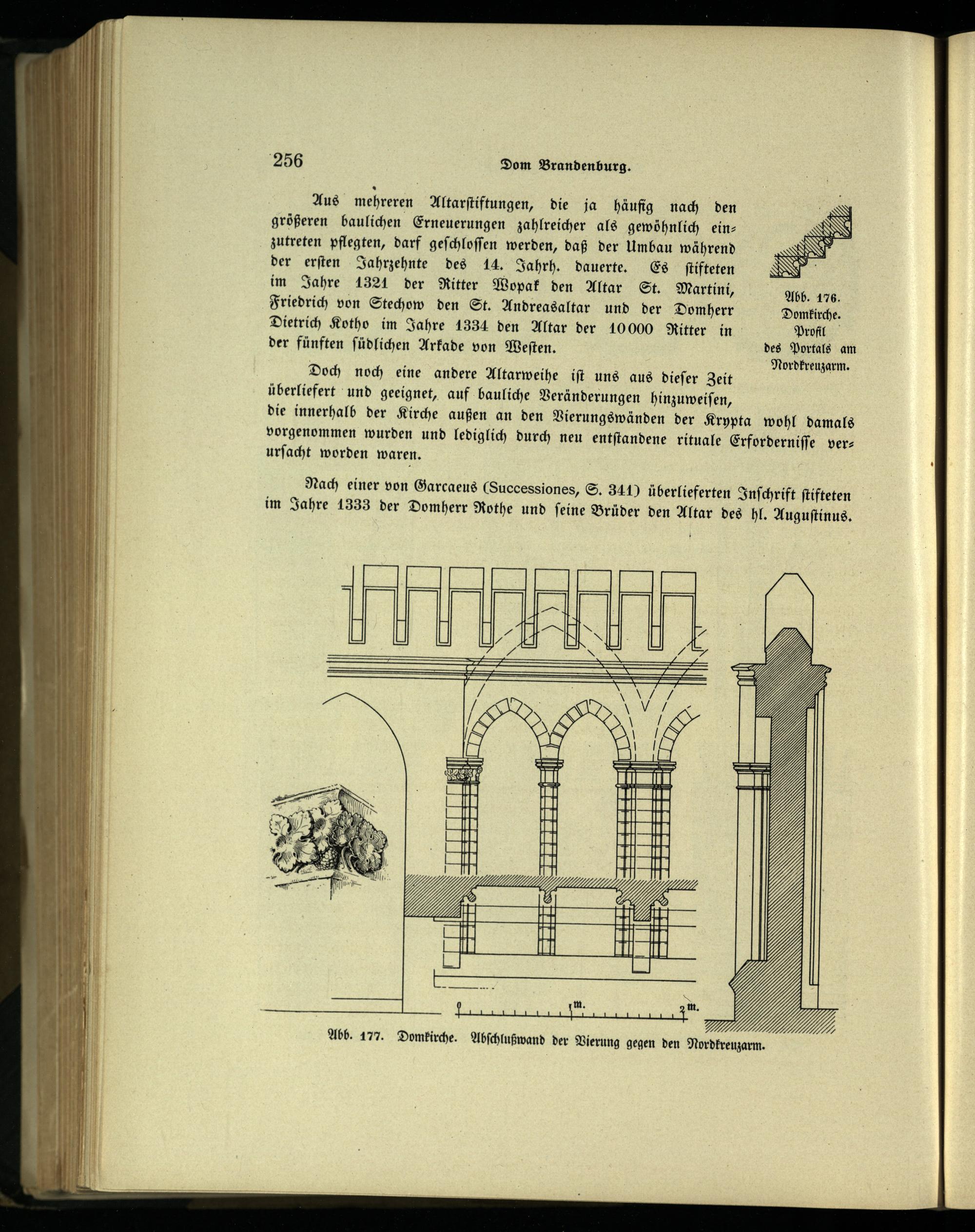 Aus mehreren Altarſtiftungen, die ja häufig nach den größeren baulichen Erneuerungen zahlreicher als gewöhnlich einzutreten pflegten, darf geſchloſſen werden, daß der Umbau während der erſten Jahrzehnte des 14. Jahrh. dauerte. Es ſtifteten im Jahre 1321 der Ritter Wopak den Altar St. Martini , Friedrich von Stechow den St. Andreasaltar und der Domherr Dietrich Kotho im Jahre 1334 den Altar der 10000 Ritter in der fünften ſüdlichen Arkade von Weſten.