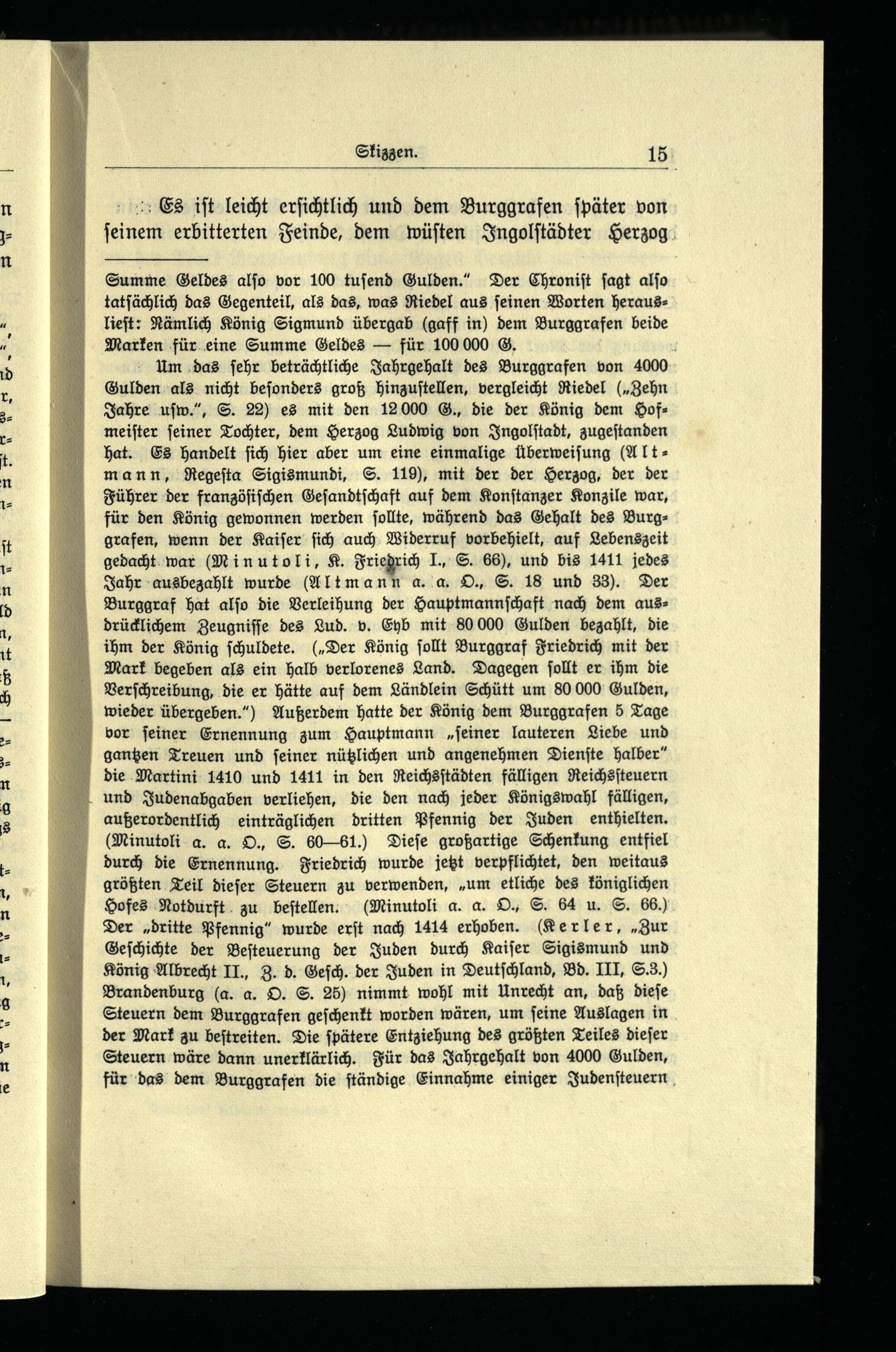 Um das ſehr beträchtliche Jahrgehalt des Burggrafen von 4000 Gulden als nicht beſonders groß hinzuſtellen, vergleicht Riedel(„Zehn Jahre uſw.“, S. 22) es mit den 12000 G., die der König dem Hofmeiſter ſeiner Tochter, dem Herzog Ludwig von Ingolſtadt, zugeſtanden hat. Es handelt ſich hier aber um eine einmalige Überweiſung(Altmann, Regeſta Sigismundi, S. 119), mit der der Herzog, der der Führer der franzöſiſchen Geſandtſchaft auf dem Konſtanzer Konzile war, für den König gewonnen werden ſollte, während das Gehalt des Burggrafen, wenn der Kaiſer ſich auch Widerruf vorbehielt, auf Lebenszeit gedacht war(Minutoli, K. Friedrich I., S. 66), und bis 1411 jedes Jahr ausbezahlt wurde(Altmann a. a. O., S. 18 und 33). Der Burggraf hat alſo die Verleihung der Hauptmannſchaft nach dem ausdrücklichem Zeugniſſe des Lud. v. Eyb mit 80 000 Gulden bezahlt, die ihm der König ſchuldete.(„Der König ſollt Burggraf Friedrich mit der Mark begeben als ein halb verlorenes Land. Dagegen ſollt er ihm die Verſchreibung, die er hätte auf dem Ländlein Schütt um 80 000 Gulden, wieder übergeben.“) Außerdem hatte der König dem Burggrafen 5 Tage vor ſeiner Ernennung zum Hauptmann„ſeiner lauteren Liebe und gantzen Treuen und feiner nützlichen und angenehmen Dienſte halber“ die Martini 1410 und 1411 in den Reichsſtädten fälligen Reichsſteuern und Judenabgaben verliehen, die den nach jeder Königswahl fälligen, außerordentlich einträglichen dritten Pfennig der Juden enthielten. (Ninutoli a. a. O., S. 60—61.) Dieſe großartige Schenkung entfiel durch die Ernennung. Friedrich wurde jetzt verpflichtet, den weitaus größten Teil dieſer Steuern zu verwenden,„um etliche des königlichen Hofes Notdurft zu beſtellen.(Minutoli a. a. O., S. 64 u. S. 66.) Der„dritte Pfennig“ wurde erſt nach 1414 erhoben.(Kerler,„Zur Geſchichte der Beſteuerung der Juden durch Kaiſer Sigismund und König Albrecht II., Z. d. Geſch. der Juden in Deutſchland , Bd. III, S..) Brandenburg(a. a. O. S. 25) nimmt wohl mit Unrecht an, daß dieſe Steuern dem Burggrafen geſchenkt worden wären, um ſeine Auslagen in der Mark zu beſtreiten. Die ſpätere Entziehung des größten Teiles dieſer Steuern wäre dann unerklärlich. Für das Jahrgehalt von 4000 Gulden, für das dem Burggrafen die ſtändige Einnahme einiger Judenſteuern