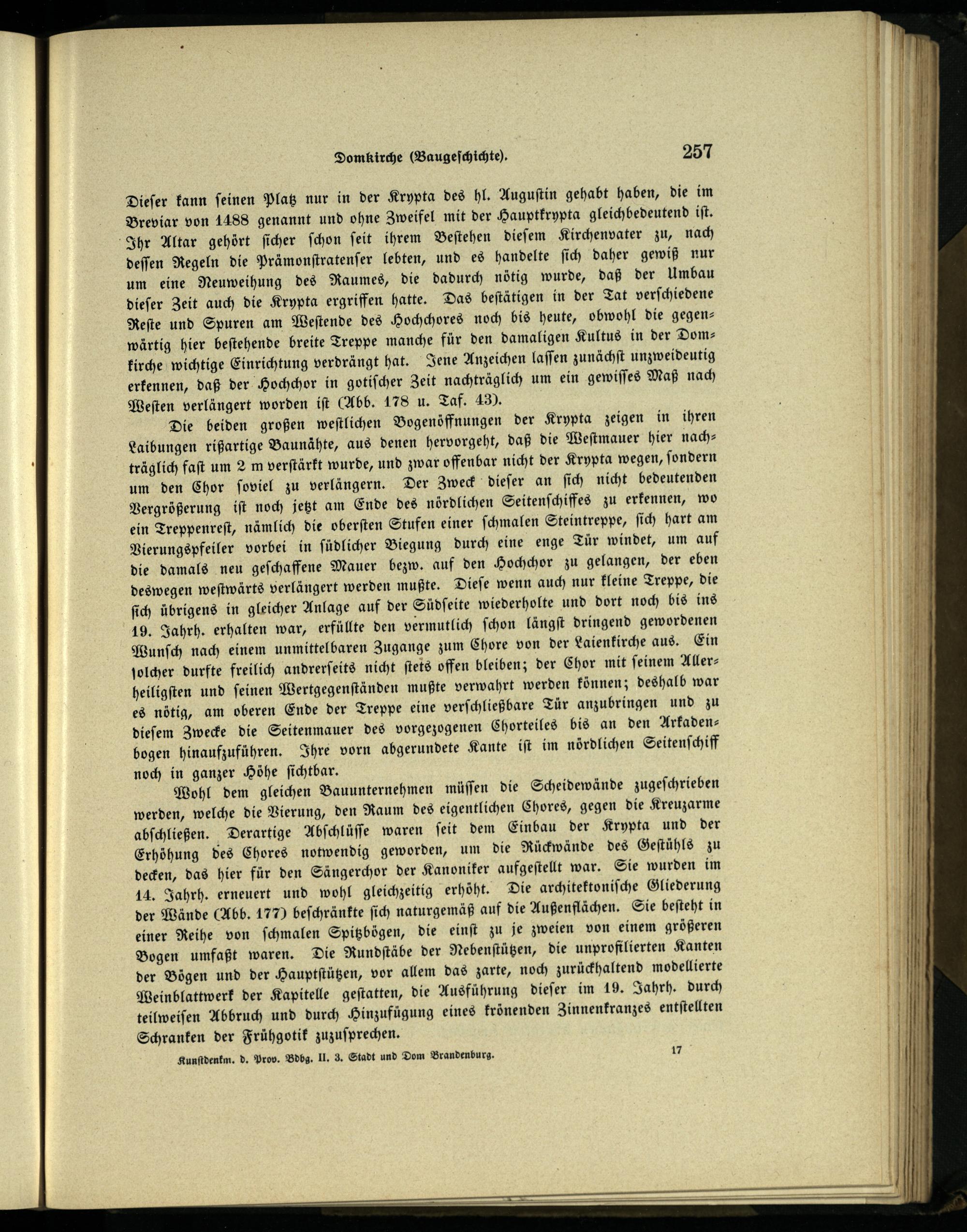 Dieſer kann feinen Platz nur in der Krypta des hl. Auguſtin gehabt haben, die im Breviar von 1488 genannt und ohne Zweifel mit der Hauptkrypta gleichbedeutend iſt. Ihr Altar gehört ſicher ſchon ſeit ihrem Beſtehen dieſem Kirchenvater zu, nach deſſen Regeln die Prämonſtratenſer lebten, und es handelte ſich daher gewiß nur um eine Neuweihung des Raumes, die dadurch nötig wurde, daß der Umbau dieſer Zeit auch die Krypta ergriffen hatte. Das beſtätigen in der Tat verſchiedene Reſte und Spuren am Weſtende des Hochchores noch bis heute, obwohl die gegenwärtig hier beſtehende breite Treppe manche für den damaligen Kultus in der Domkirche wichtige Einrichtung verdrängt hat. Jene Anzeichen laſſen zunächſt unzweideutig erkennen, daß der Hochchor in gotiſcher Zeit nachträglich um ein gewiſſes Maß nach Welten verlängert worden iſt(Abb. 178 u. Taf. 43).