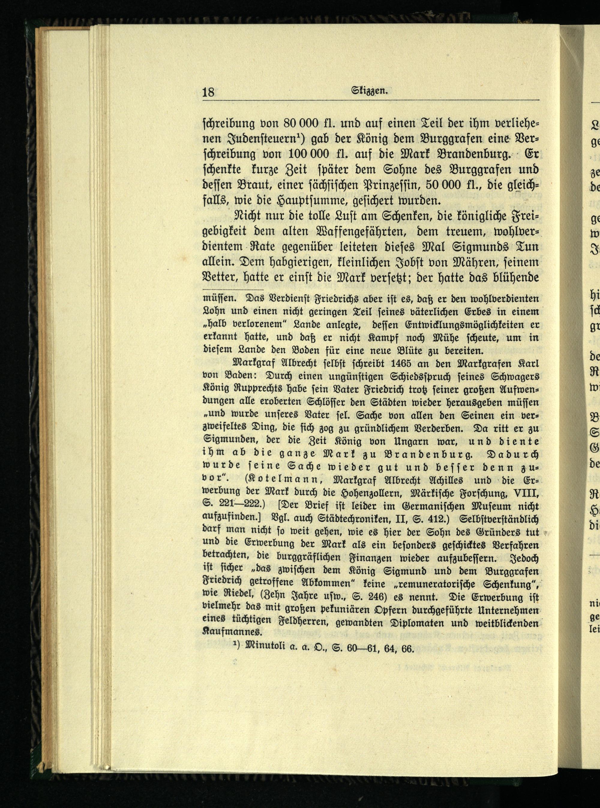 Markgraf Albrecht ſelbſt ſchreibt 1465 an den Markgrafen Karl von Baden : Durch einen ungünſtigen Schiedsſpruch ſeines Schwagers König Rupprechts habe ſein Vater Friedrich trotz ſeiner großen Aufwendungen alle eroberten Schlöſſer den Städten wieder herausgeben müſſen und wurde unſeres Vater ſel. Sache von allen den Seinen ein verzweifeltes Ding, die ſich zog zu gründlichem Verderben. Da ritt er zu Sigmunden, der die Zeit König von Ungarn war, und diente ihm ab die ganze Mark zu Brandenburg. Dadurch wurde ſeine Sache wieder gut und beſſer denn zuvor“.(Kotelmann, Markgraf Albrecht Achilles und die Erwerbung der Mark durch die Hohenzollern , Märkiſche Forſchung, VIII, S. 221—222.)[Der Brief iſt leider im Germaniſchen Muſeum nicht aufzufinden.] Vgl. auch Städtechroniken, II, S. 412.) Selbſtverſtändlich darf man nicht ſo weit gehen, wie es hier der Sohn des Gründers tut und die Erwerbung der Mark als ein beſonders geſchicktes Verfahren betrachten, die burggräflichen Finanzen wieder aufzubeſſern. Jedoch iſt ſicher„das zwiſchen dem König Sigmund und dem Burggrafen