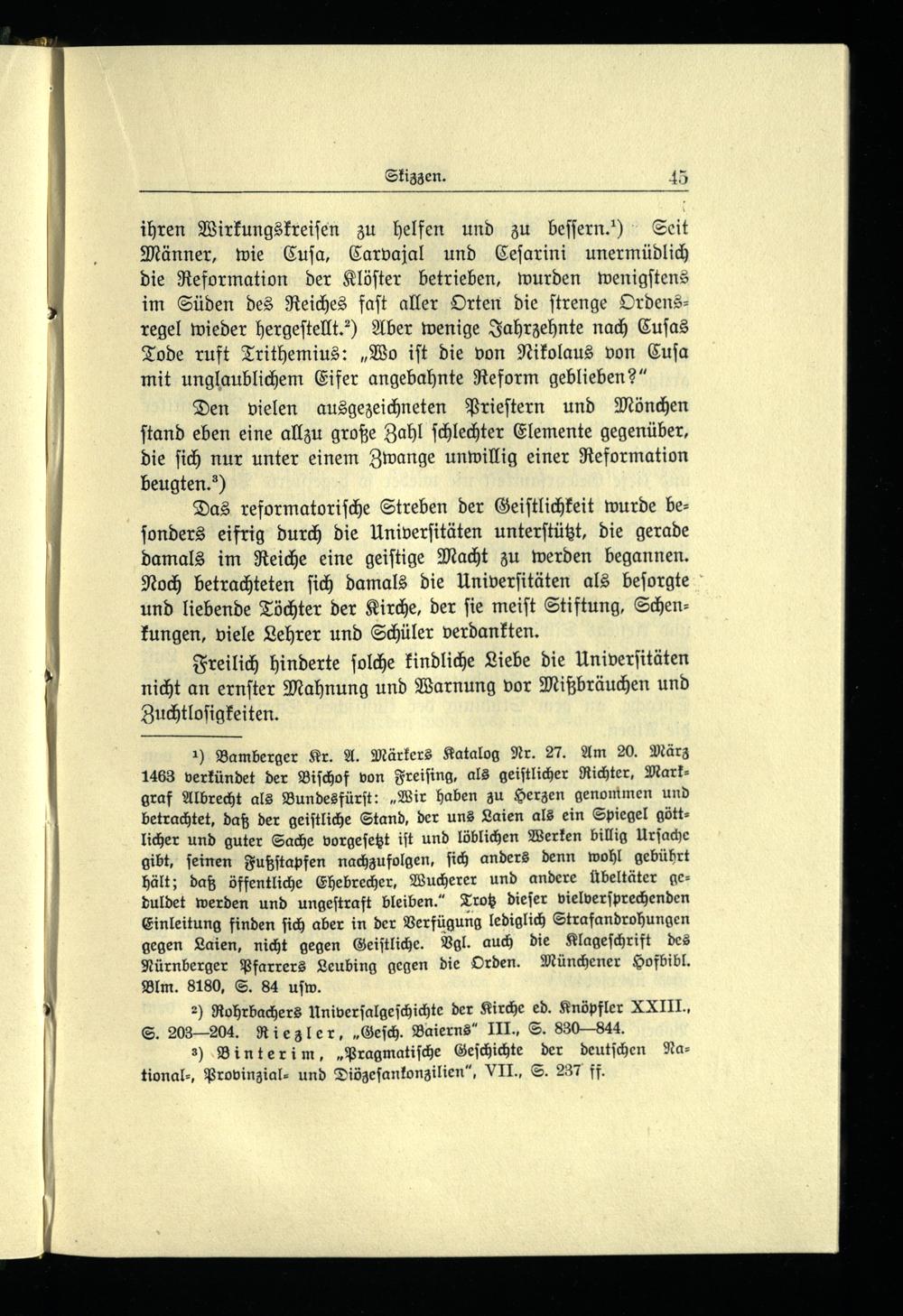 1) Bamberger Kr. A. Märkers Katalog Nr. 27. Am 20. März 1463 verkündet der Biſchof von Freiſing, als geiſtlicher Richter, Markgraf Albrecht als Bundesfürſt:„Wir haben zu Herzen genommen und betrachtet, daß der geiſtliche Stand, der uns Laien als ein Spiegel göttlicher und guter Sache vorgeſetzt iſt und löblichen Werken billig Urſache gibt, ſeinen Fußſtapfen nachzufolgen, ſich anders denn wohl gebührt hält; daß öffentliche Ehebrecher, Wucherer und andere Übeltäter geduldet werden und ungeſtraft bleiben.“ Trotz dieſer vielverſprechenden Einleitung finden ſich aber in der Verfügung lediglich Strafandrohungen gegen Laien, nicht gegen Geiſtliche. Vgl. auch die Klageſchrift des Nürnberger Pfarrers Leubing gegen die Orden. Münchener Hofbibl. Blm. 8180, S. 84 uſw.