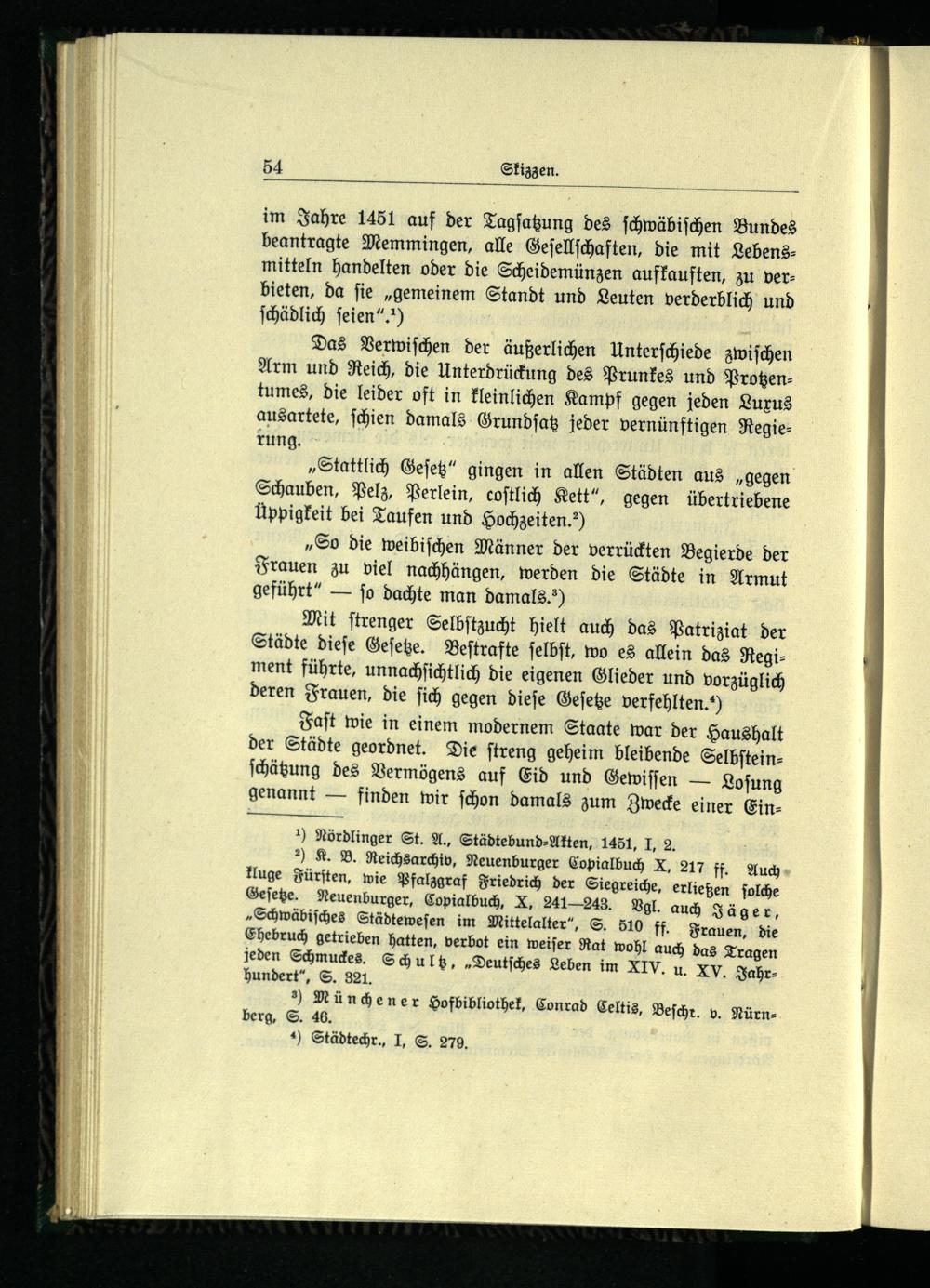 2) K. B. Reichsarchiv, Neuenburger Copialbuch X, 217 ff. Auch kluge Fürſten, wie Pfalzgraf Friedrich der Siegreiche, erließen ſolche Geſetze. Neuenburger, Copialbuch, X, 241-248. Vgl. auch Jäger, „Schwäbiſches Städteweſen im Mittelalter“, S. 510 ff. Frauen, die Ehebruch getrieben hatten, verbot ein weiſer Rat wohl auch das Tragen jeden Schmuckes. Schultz,„Deutſches Leben im XIV. u. XV. Jahrhundert“, S. 321.