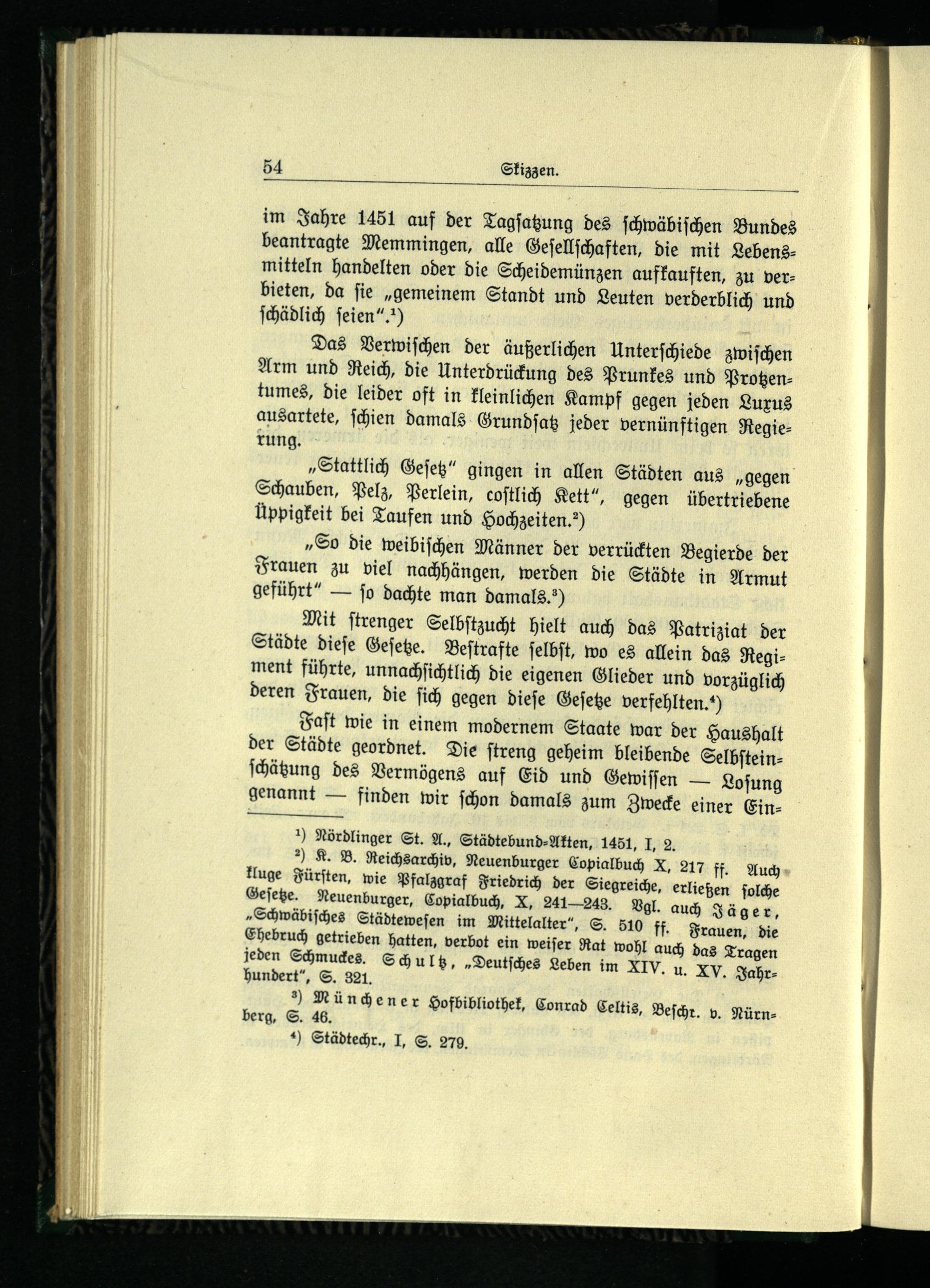 im Jahre 1451 auf der Tagſatzung des ſchwäbiſchen Bundes beantragte Memmingen , alle Geſellſchaften, die mit Lebensmitteln handelten oder die Scheidemünzen aufkauften, zu verbieten, da fie„gemeinem Standt und Leuten verderblich und ſchädlich ſeien“.)