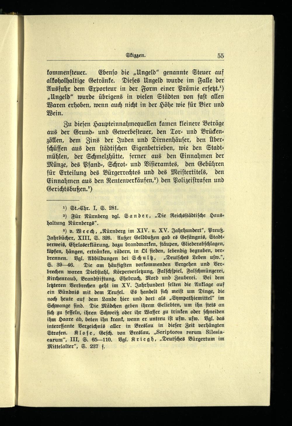 3) v. Weech,Nürnberg im XIV. u. XV. Jahrhundert, Preuß. Jahrbücher, XIII, S. 326. Außer Geldbußen gab es Gefängnis, Stadt­verweis, Ehrloserklärung, dazu brandmarken, ſtäupen, Gliederabſchlagen, köpfen, hängen, ertränken, rädern, in Ol ſieden, lebendig begraben, ver­brennen. Vgl. Abbildungen bei Schultz,Deutſches Leben uſw., S. 3946. Die am häufigſten vorkommenden Vergehen und Ver­brechen waren Diebſtahl, Körperverletzung, Falſchſpiel, Falſchmünzerei, Kirchenraub, Brandſtiftung, Ehebruch, Mord und Zauberei. Bei dem letzteren Verbrechen geht im XV. Jahrhundert ſelten die Anklage auf ein Bündnis mit dem Teufel. Es handelt ſich meiſt um Dinge, die noch heute auf dem Lande hier und dort alsSympathiemittel im Schwange ſind. Die Mädchen geben ihrem Geliebten, um ihn ſtets an ſich zu feſſeln, ihren Schweiß oder ihr Waſſer zu trinken oder ſchneiden ihm Haare ab, beten ihn krank, wenn er untreu iſt uſw. uſw. Vgl. das intereſſante Verzeichnis aller in Breslau in dieſer Zeit verhängten Strafen. Kloſe, Geſch. von Breslau ,Seriptores rerum Silesia­carum, III, S. 65110. Vgl. Kriegh,Deutſches Bürgertum im Mittelalter, S. 237 f.