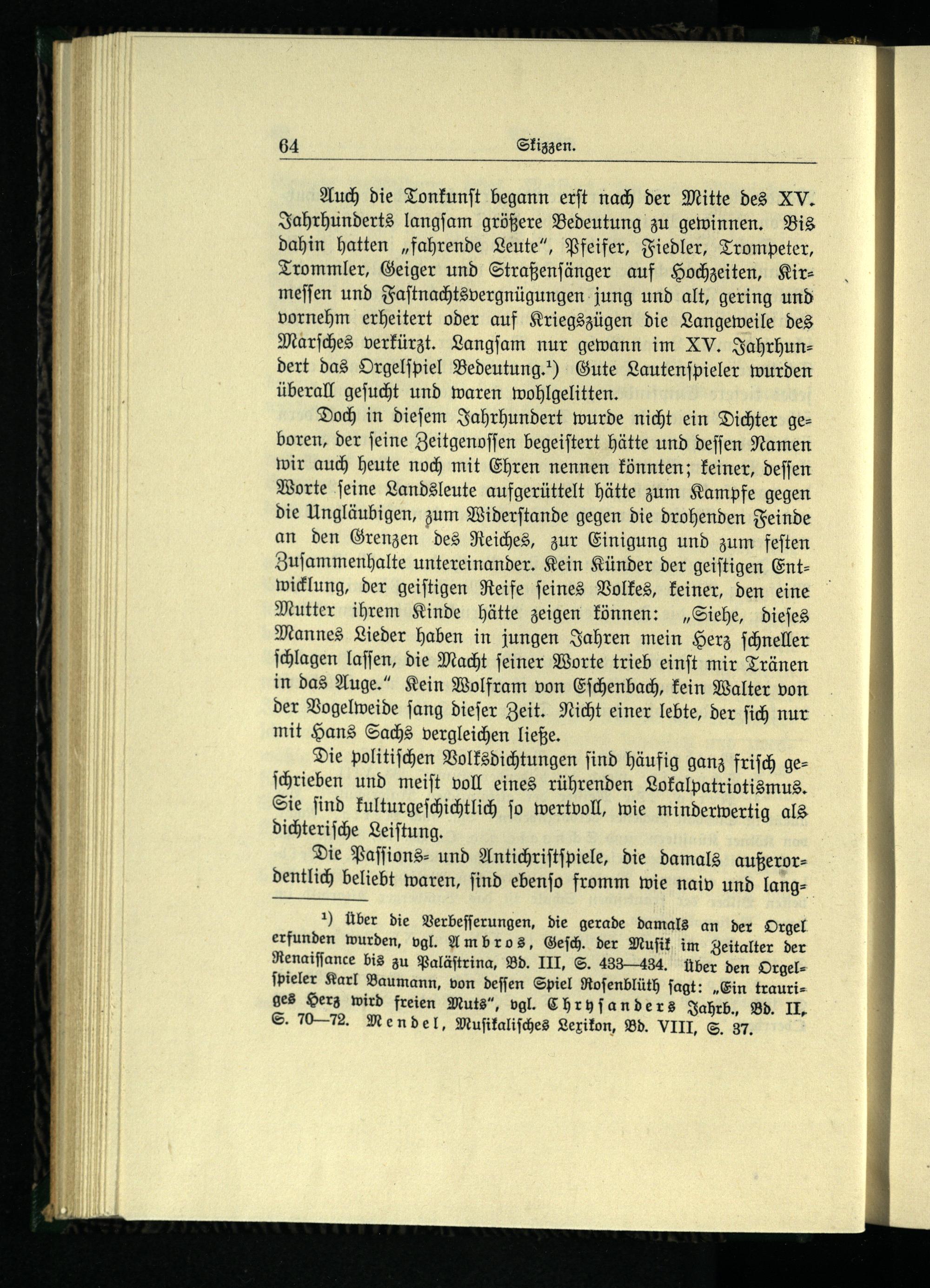 Doch in dieſem Jahrhundert wurde nicht ein Dichter geboren, der ſeine Zeitgenoſſen begeiſtert hätte und deſſen Namen wir auch heute noch mit Ehren nennen könnten; keiner, deſſen Worte ſeine Landsleute aufgerüttelt hätte zum Kampfe gegen die Ungläubigen, zum Widerſtande gegen die drohenden Feinde an den Grenzen des Reiches, zur Einigung und zum feſten Zuſammenhalte untereinander. Kein Künder der geiſtigen Entwicklung, der geiſtigen Reife ſeines Volkes, keiner, den eine Mutter ihrem Kinde hätte zeigen können:„Siehe, dieſes Mannes Lieder haben in jungen Jahren mein Herz ſchneller ſchlagen laſſen, die Macht ſeiner Worte trieb einſt mir Tränen in das Auge.“ Kein Wolfram von Eſchenbach , kein Walter von der Vogelweide ſang dieſer Zeit. Nicht einer lebte, der ſich nur mit Hans Sachs vergleichen ließe.