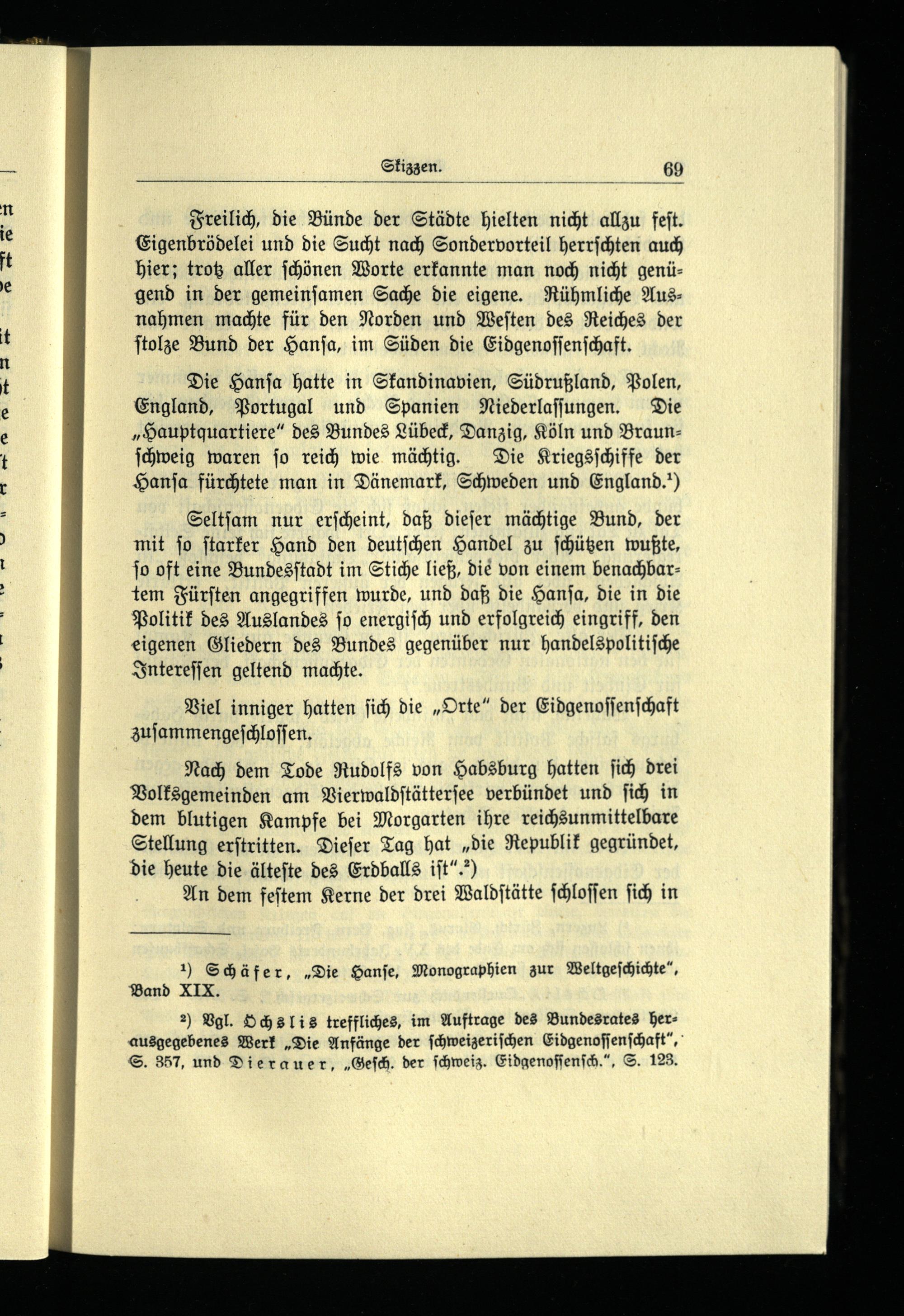 Freilich, die Bünde der Städte hielten nicht allzu feſt. Eigenbrödelei und die Sucht nach Sondervorteil herrſchten auch hier; trotz aller ſchönen Worte erkannte man noch nicht genügend in der gemeinſamen Sache die eigene. Rühmliche Ausnahmen machte für den Norden und Weſten des Reiches der ſtolze Bund der Hanſa, im Süden die Eidgenoſſenſchaft.