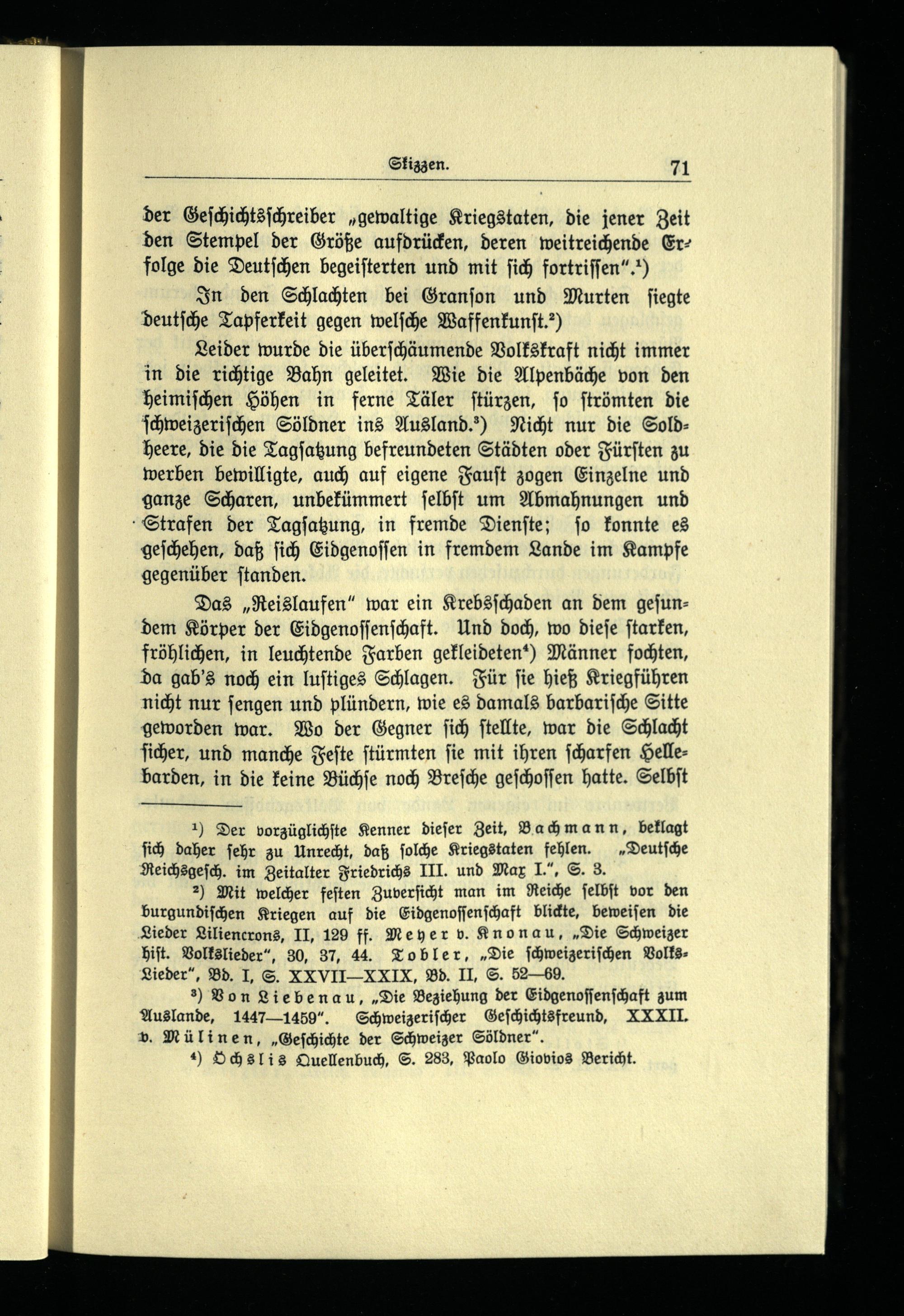 2) Mit welcher feſten Zuverſicht man im Reiche ſelbſt vor den burgundiſchen Kriegen auf die Eidgenoſſenſchaft blickte, beweiſen die Lieder Liliencrons, II, 129 ff. Meyer v. Knonau,„Die Schweizer hiſt. Volkslieder“, 30, 37, 44. Tobler,„Die ſchweizeriſchen VolksLieder“, Bd. I, S. XXVII-XXIX, Bd. II, S. 52—69.