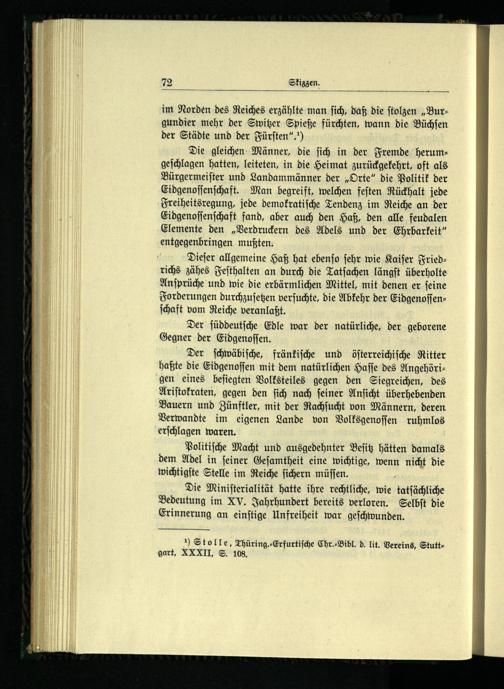 Der ſchwäbiſche, fränkiſche und öſterreichiſche Ritter haßte die Eidgenoſſen mit dem natürlichen Haſſe des Angehörigen eines beſiegten Volksteiles gegen den Siegreichen, des Ariſtokraten, gegen den ſich nach ſeiner Anſicht überhebenden Bauern und Zünftler, mit der Rachſucht von Männern, deren Verwandte im eigenen Lande von Volksgenoſſen e erſchlagen waren.