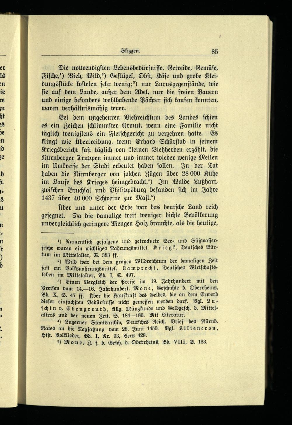 Bei dem ungeheuren Viehreichtum des Landes ſchien es ein Zeichen ſchlimmſter Armut, wenn eine Familie nicht täglich wenigſtens ein Fleiſchgericht zu verzehren hatte. Es klingt wie Übertreibung, wenn Erhard Schürſtab in ſeinem Kriegsbericht faſt täglich von kleinen Viehherden erzählt, die Nürnberger Truppen immer und immer wieder wenige Meilen im Umkreiſe der Stadt erbeutet haben ſollen. In der Tat haben die Nürnberger von ſolchen Zügen über 28 000 Kühe im Laufe des Krieges heimgebracht.“) Im Walde Lußhart, zwiſchen Bruchſal und Philippsburg befanden ſich im Jahre 1437 über 40 000 Schweine zur Maſt.“)