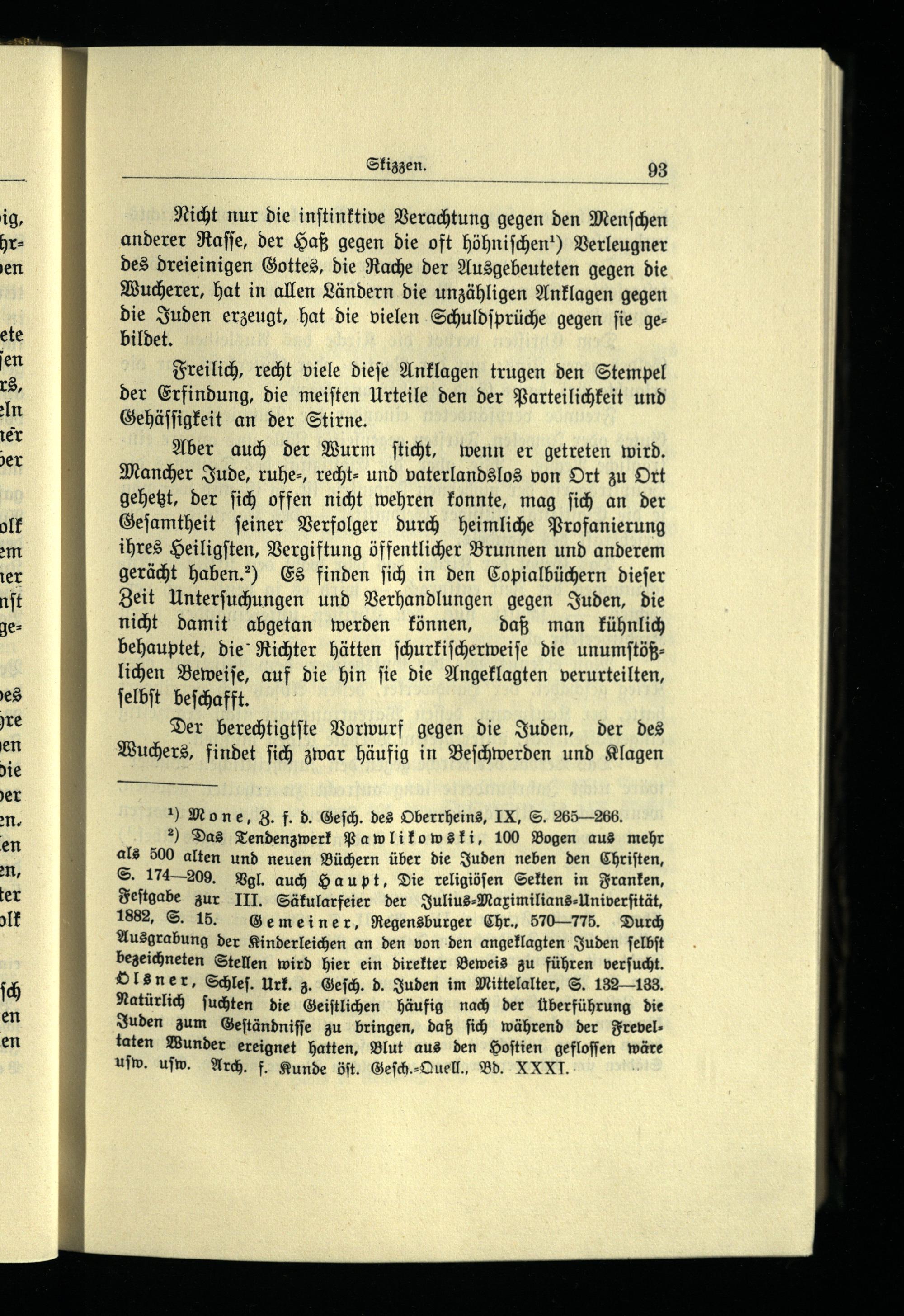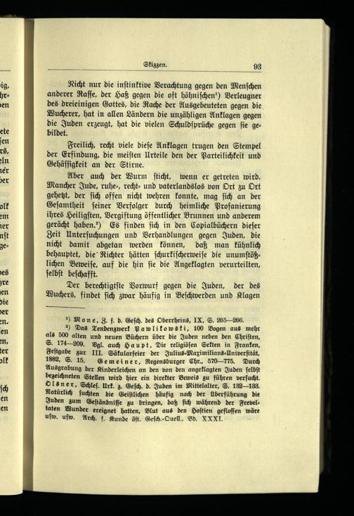 ) Das Tendenzwerk Pawlikowski, 100 Bogen aus mehr als 500 alten und neuen Büchern über die Juden neben den Chriſten, S. 174209. Vgl. auch Haupt, Die religiöſen Sekten in Franken, Feſtgabe zur III. Säkularfeier der Julius⸗Maximilians-Univerſität , 1882, S. 15. Gemeiner, Regensburger Chr., 570775. Durch Ausgrabung der Kinderleichen an den von den angeklagten Juden ſelbſt bezeichneten Stellen wird hier ein direkter Beweis zu führen verſucht. Olsner, Schleſ. Urk. z. Geſch. d. Juden im Mittelalter, S. 132—183. Natürlich ſuchten die Geiſtlichen häufig nach der Überführung die Juden zum Geſtändniſſe zu bringen, daß ſich während der Freveltaten Wunder ereignet hatten, Blut aus den Hoſtien gefloſſen wäre uſw. uſw. Arch. f. Kunde öſt. Geſch.⸗Quell., Bd. XXXI.