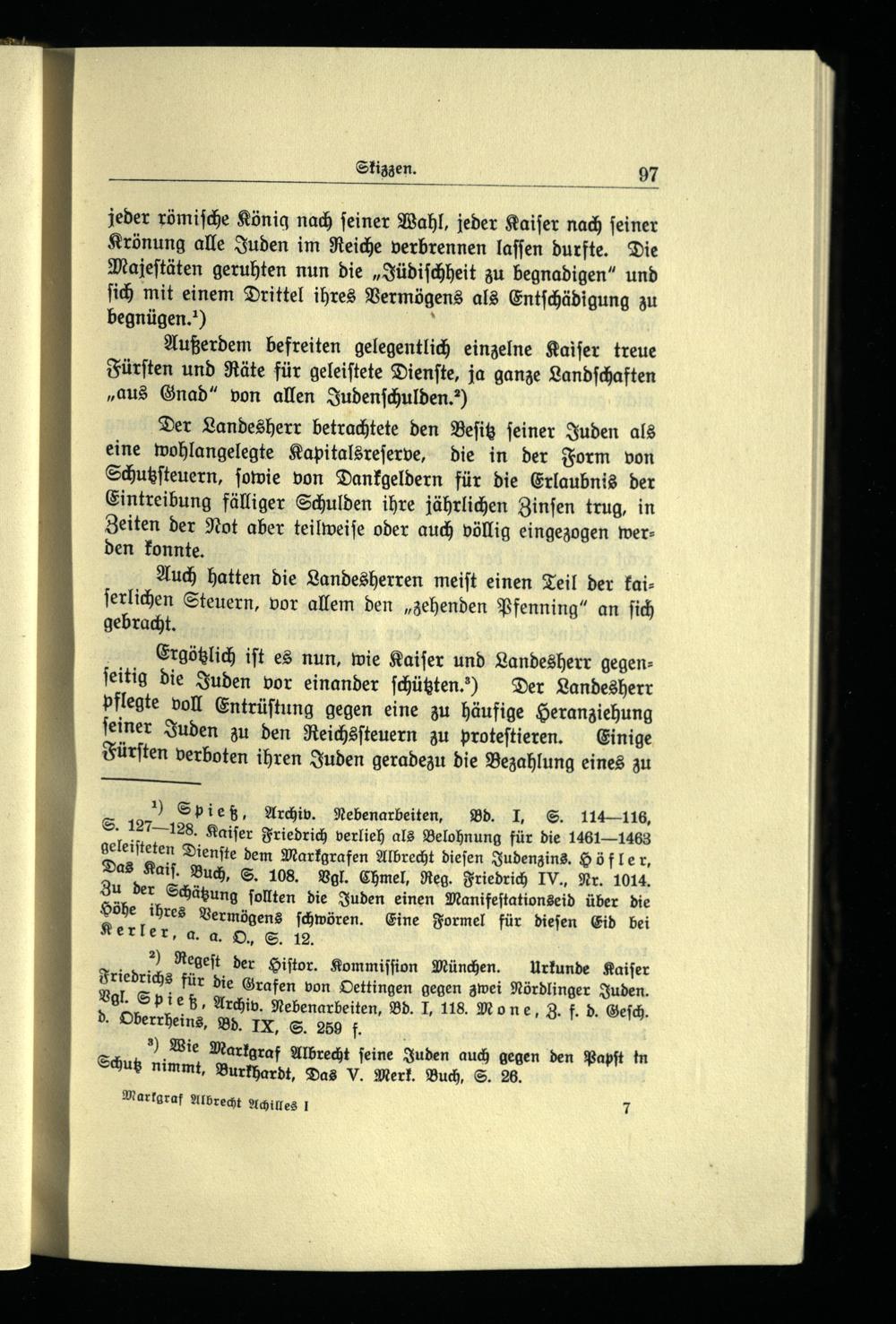 ) Spieß, Archiv. Nebenarbeiten. Bd. I, S. 114116, S. 127128. Kaiſer Friedrich verlieh als Belohnung für die 1461—1463 geleiſteten Dienſte dem Markgrafen Albrecht dieſen Judenzins. Höfler, Das Kaiſ. Buch, S. 108. Vgl. Chmel, Reg. Friedrich IV., Nr. 1014. Zu der Schätzung ſollten die Juden einen Manifeſtationseid über die Höhe ihres Vermögens ſchwören. Eine Formel für dieſen Eid bei Kerler, a. a. O, S. 12.