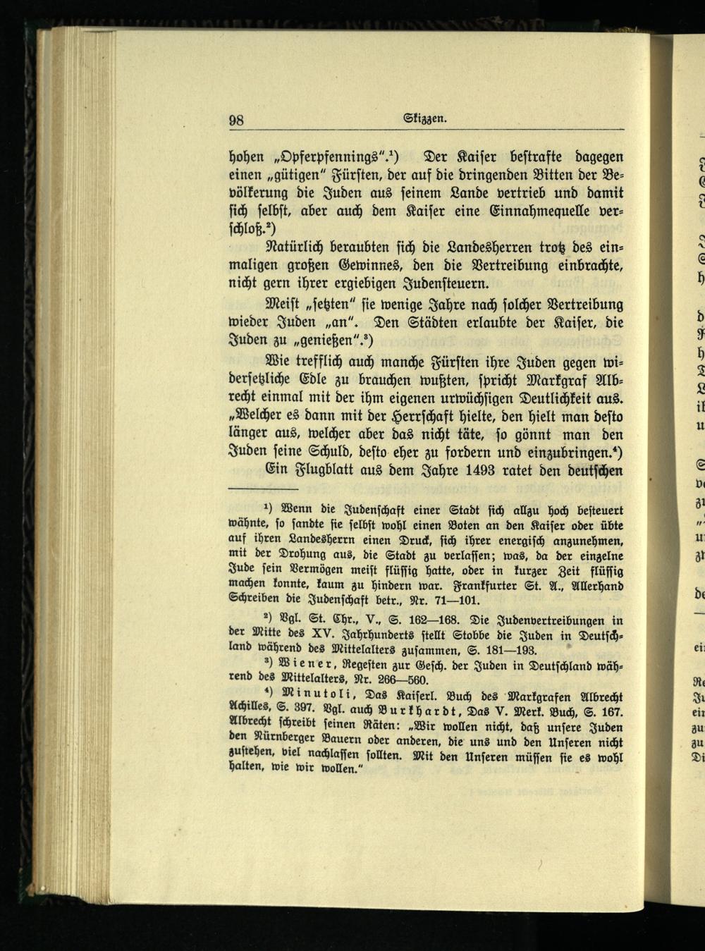 Wie trefflich auch manche Fürſten ihre Juden gegen widerſetzliche Edle zu brauchen wußten, ſpricht Markgraf Albrecht einmal mit der ihm eigenen urwüchſigen Deutlichkeit aus. „Welcher es dann mit der Herrſchaft hielte, den hielt man deſto länger aus, welcher aber das nicht täte, ſo gönnt man den Juden ſeine Schuld, deſto eher zu fordern und einzubringen.“)