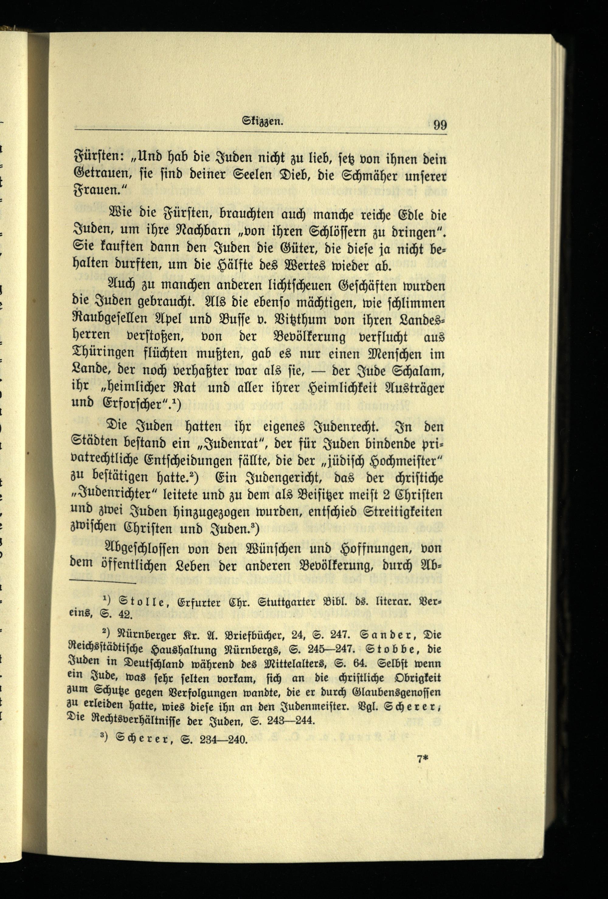 ) Nürnberger Kr. A. Briefbücher, 24, S. 247. Sander, Die Reichsſtädtiſche Haushaltung Nürnbergs , S. 245247. Stobbe, die Juden in Deutſchland während des Mittelalters, S. 64. Selbſt wenn ein Jude, was ſehr ſelten vorkam, ſich an die chriſtliche Obrigkeit zum Schutze gegen Verfolgungen wandte, die er durch Glaubensgenoſſen zu erleiden hatte, wies dieſe ihn an den Judenmeiſter. Vgl. Scherer, Die Rechtsverhältniſſe der Juden, S. 243244.