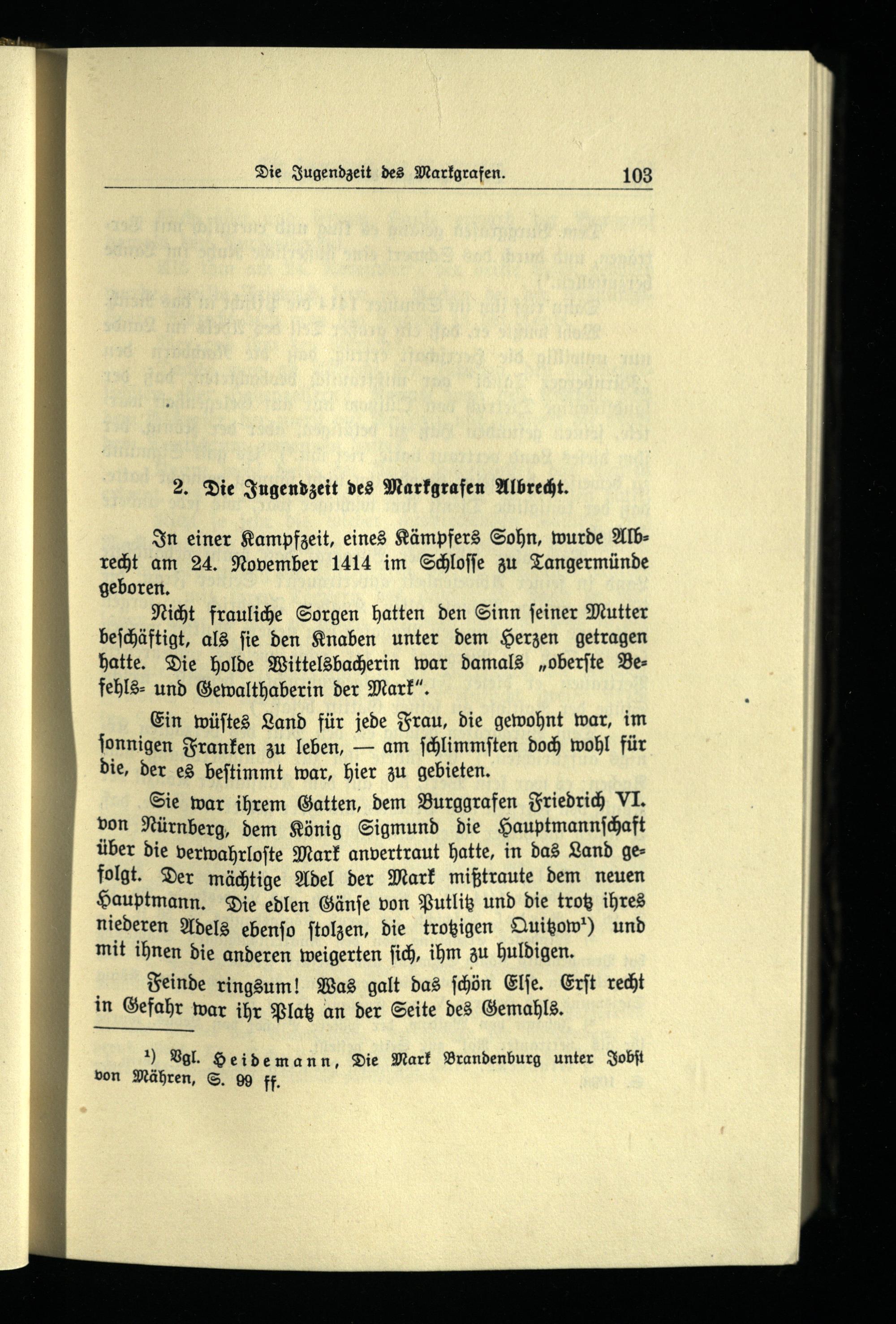 In einer Kampfzeit, eines Kämpfers Sohn, wurde Albrecht am 24. November 1414 im Schloſſe zu Tangermünde geboren.