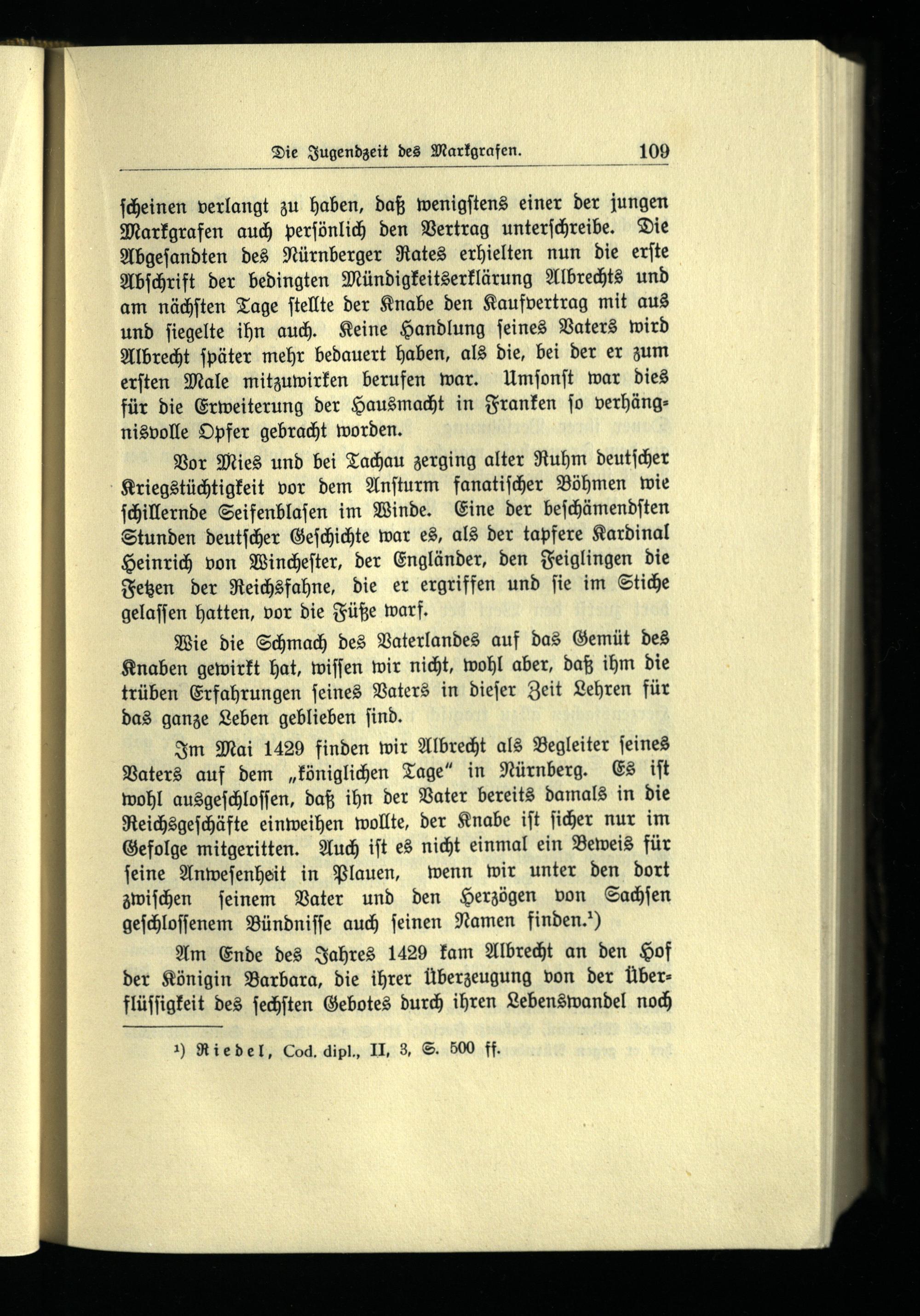 Im Mai 1429 finden wir Albrecht als Begleiter ſeines Vaters auf dem„königlichen Tage“ in Nürnberg . Es iſt wohl ausgeſchloſſen, daß ihn der Vater bereits damals in die Reichsgeſchäfte einweihen wollte, der Knabe iſt ſicher nur im Gefolge mitgeritten. Auch iſt es nicht einmal ein Beweis für ſeine Anweſenheit in Plauen , wenn wir unter den dort zwiſchen ſeinem Vater und den Herzögen von Sachſen geſchloſſenem Bündniſſe auch ſeinen Namen finden.“)