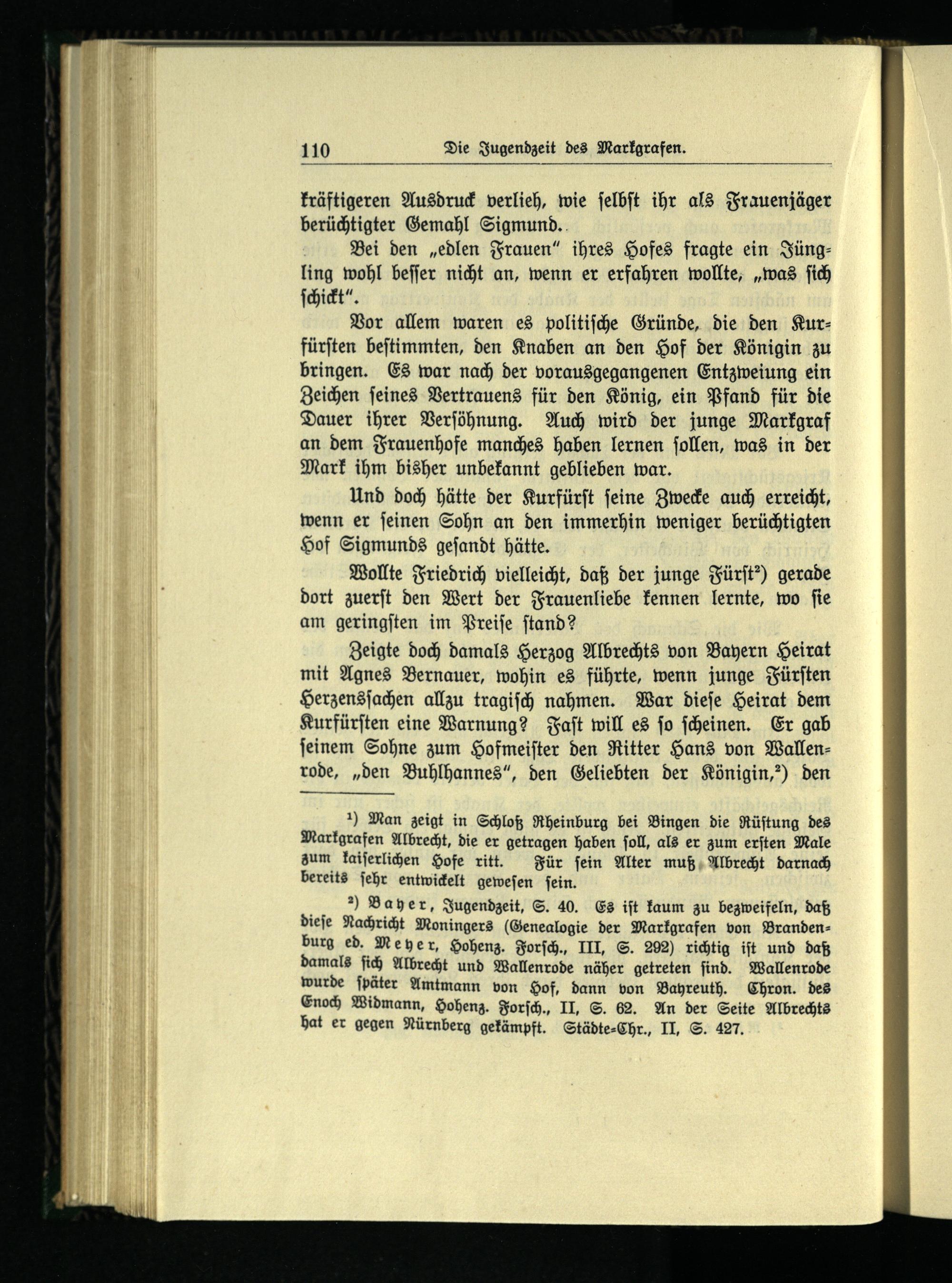 Zeigte doch damals Herzog Albrechts von Bayern Heirat mit Agnes Bernauer , wohin es führte, wenn junge Fürſten Herzensſachen allzu tragiſch nahmen. War dieſe Heirat dem Kurfürſten eine Warnung? Faſt will es fo ſcheinen. Er gab ſeinem Sohne zum Hofmeiſter den Ritter Hans von Wallenrode,„den Buhlhannes“, den Geliebten der Königin,?) den