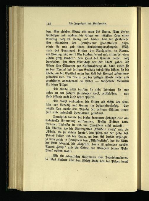 den. Am gleichen Abend ritt man bis Nama. Von dieſem Städtchen aus machten die Pilger am nächſten Tage einen Ausflug nach St. Georg und hörten dort die Frühmeſſe. Der Guardian des Jeruſalemer Zionskloſters abſolvierte ſie und gab ihnen Verhaltungsmaßregeln. Während des Sonntages blieben die Markgrafen in Ronna, am Montag früh um 1 Uhr brachen ſie auf und ritten bei einer „ſchön groß Kirchen“, dem Haus des Emaus, vorbei, nach Jeruſalem . In einer Wirtſchaft vor der Stadt gaben die Pilger ihre Schwerter zur Aufbewahrung ab, dann eilten ſie zu dem Tempel des heiligen Grabes; inbrünſtig küßten ſie die Stelle, an der Chriſtus unter der Laſt des Kreuzes zuſammengebrochen war. Sie knieten vor der heiligen Pforte nieder und verrichteten andachtsvoll ein Gebet— weihevolle Minuten für jeden Pilger.