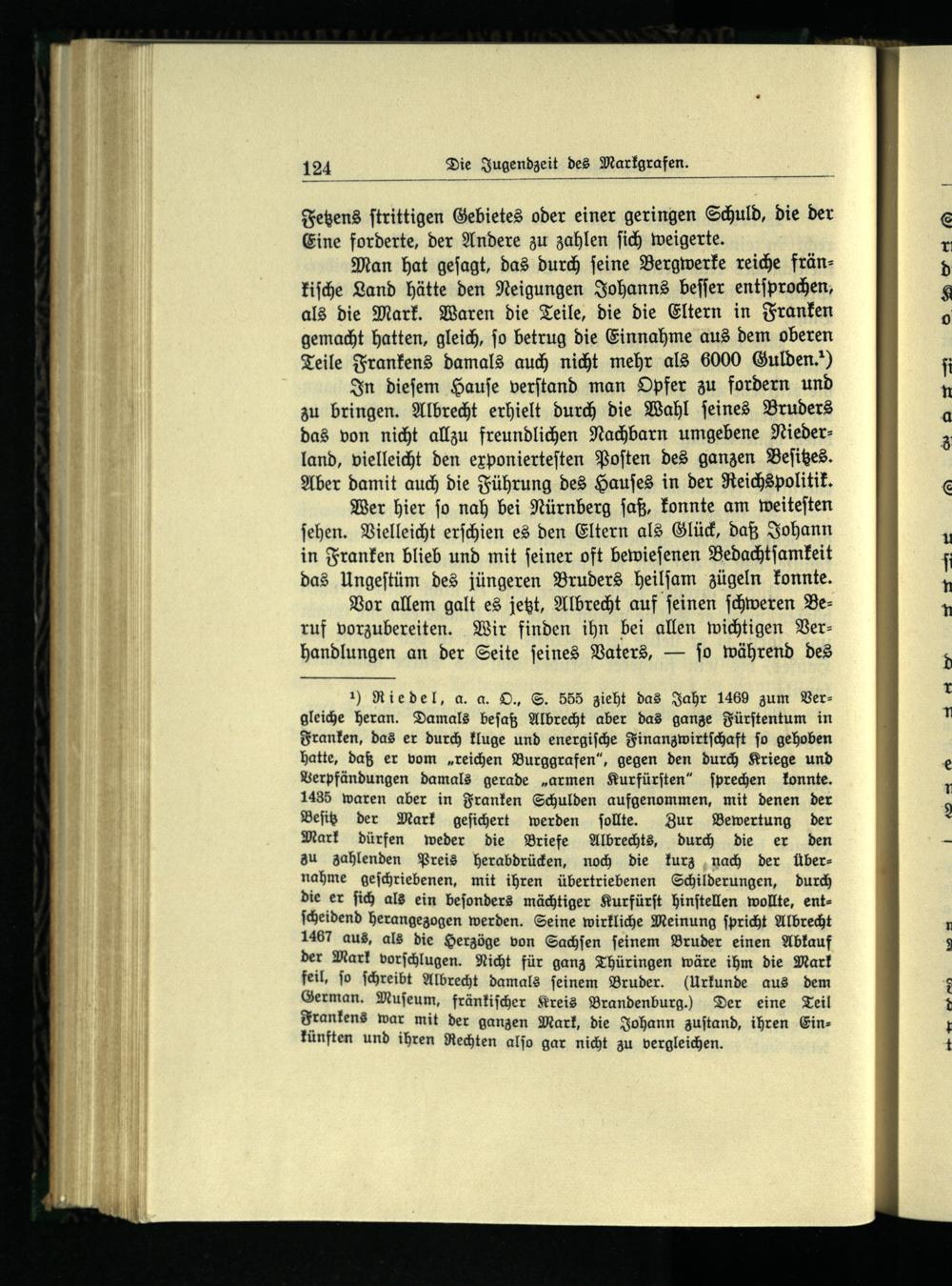 Man hat geſagt, das durch ſeine Bergwerke reiche fränkiſche Land hätte den Neigungen Johanns beſſer entſprochen, als die Mark. Waren die Teile, die die Eltern in Franken gemacht hatten, gleich, ſo betrug die Einnahme aus dem oberen Teile Frankens damals auch nicht mehr als 6000 Gulden.“)