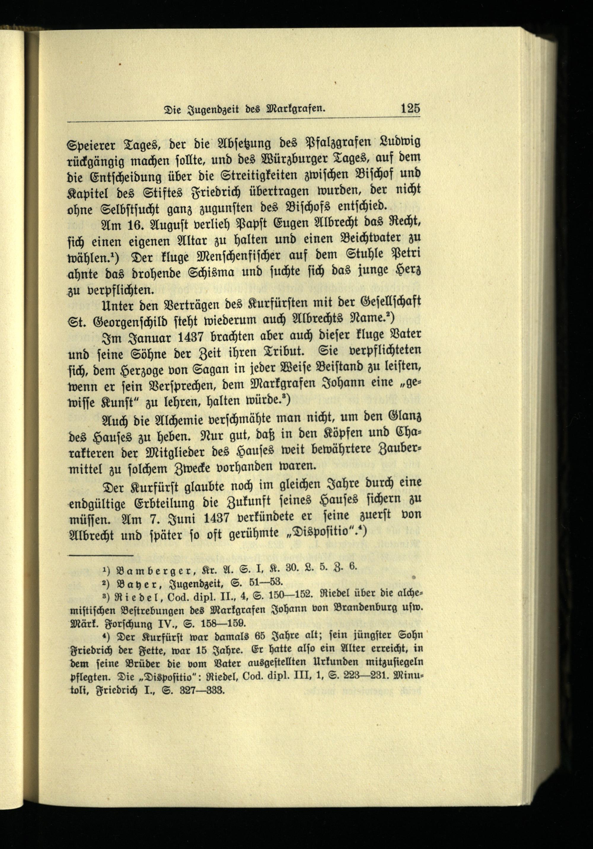Der Kurfürſt glaubte noch im gleichen Jahre durch eine endgültige Erbteilung die Zukunft ſeines Hauſes ſichern zu müſſen. Am 7. Juni 1437 verkündete er ſeine zuerſt von Albrecht und ſpäter ſo oft gerühmte„Dispoſitio“.“