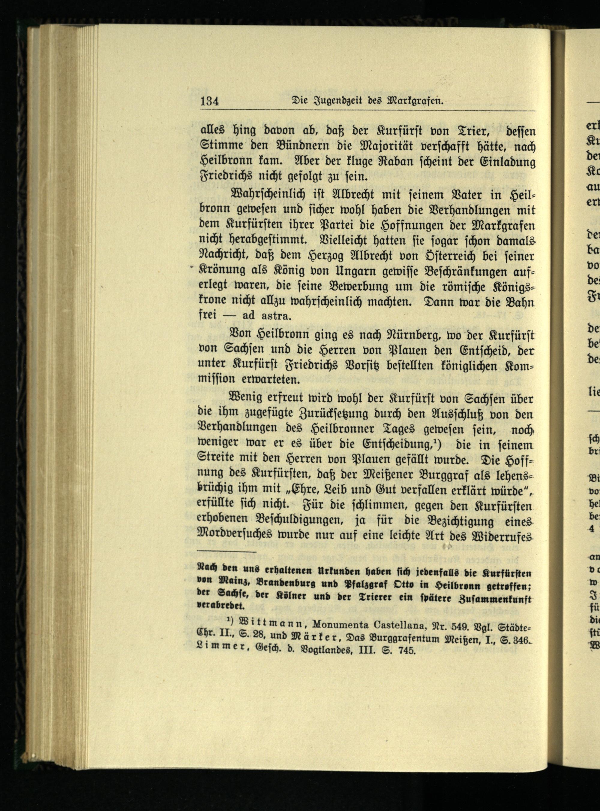 Wahrſcheinlich iſt Albrecht mit ſeinem Vater in Heil bronn geweſen und ſicher wohl haben die Verhandlungen mit dem Kurfürſten ihrer Partei die Hoffnungen der Markgrafen nicht herabgeſtimmt. Vielleicht hatten ſie ſogar ſchon damals Nachricht, daß dem Herzog Albrecht von Oſterreich bei feiner Krönung als König von Ungarn gewiſſe Beſchränkungen auf: erlegt waren, die ſeine Bewerbung um die römiſche Königskrone nicht allzu wahrſcheinlich machten. Dann war die Bahn frei— ad astra.