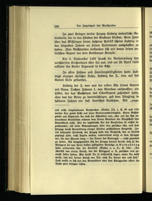 und nicht eingehaltenen Verſprechen(Riedel, III, 1, S. 98 und 113) werfen kein gutes Licht auf ſeine Vertrauenswürdigkeit. Seine Rechtsgebote auf Sigmund, der doch der Schuldner war, oder auf die ihm befreundeten Kurfürſten nehmen dem klaren Wortlaut der Bürgſchaft ihre Beweiskraft nicht. Für die ſophiſtiſche Art des Kurfürſten iſt nichts bezeichnender, als ſeine Behauptungen über den zwiſchen ihm und dem Herzoge durch Vermittlung einiger Fürſten geſchloſſenen Vergleich. Zuerſt behauptet Friedrich, der Herzog habe den Vergleich, den er bereits zugeſagt habe, nicht ſiegeln wollen, andererſeits wirft er dem Herzoge vor, ihn drei Monate lang— der Dauer des Vertrages— nicht gemahnt zu haben. Als demgegenüber ſich der Herzog darauf beruft, daß ja der Pfalzgraf die von ihnen beiden geſiegelten Verträge in Verwahrung habe, antwortete ihm der Kurfürſt(Riedel, a. a. O., S. 164):„Du ſchreibſt von einem Anlaß, den der Pfalzgraf u. A. zwiſchen uns gemacht ſollen haben. Wie darfſt Du ſo wiſſentlich lügen, wenn Du wohl weißt, daß wir keinen Anlaß von Dir, noch Du keinen von uns haſt.“ Doch wollte er ſich von den Vermittlern oder dem Pfalzgrafen allein die Sache gern beſagen laſſen.