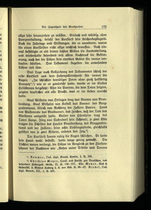 Drei Tage nach Vollziehung des Teſtamentes ſchloß der erſte Kurfürſt aus dem Hohenzollernhauſe für immer die Augen.„In ſchlichter demütiger Form ohne groß hoffärtig Pompey“,) wie er es gewünſcht hatte, wurde er im Kloſter Heilsbronn beigeſetzt: Aber die Paniere, die dem Toten folgten, zeigten deutlicher als alle Pracht, was er im Leben erreicht hatte.