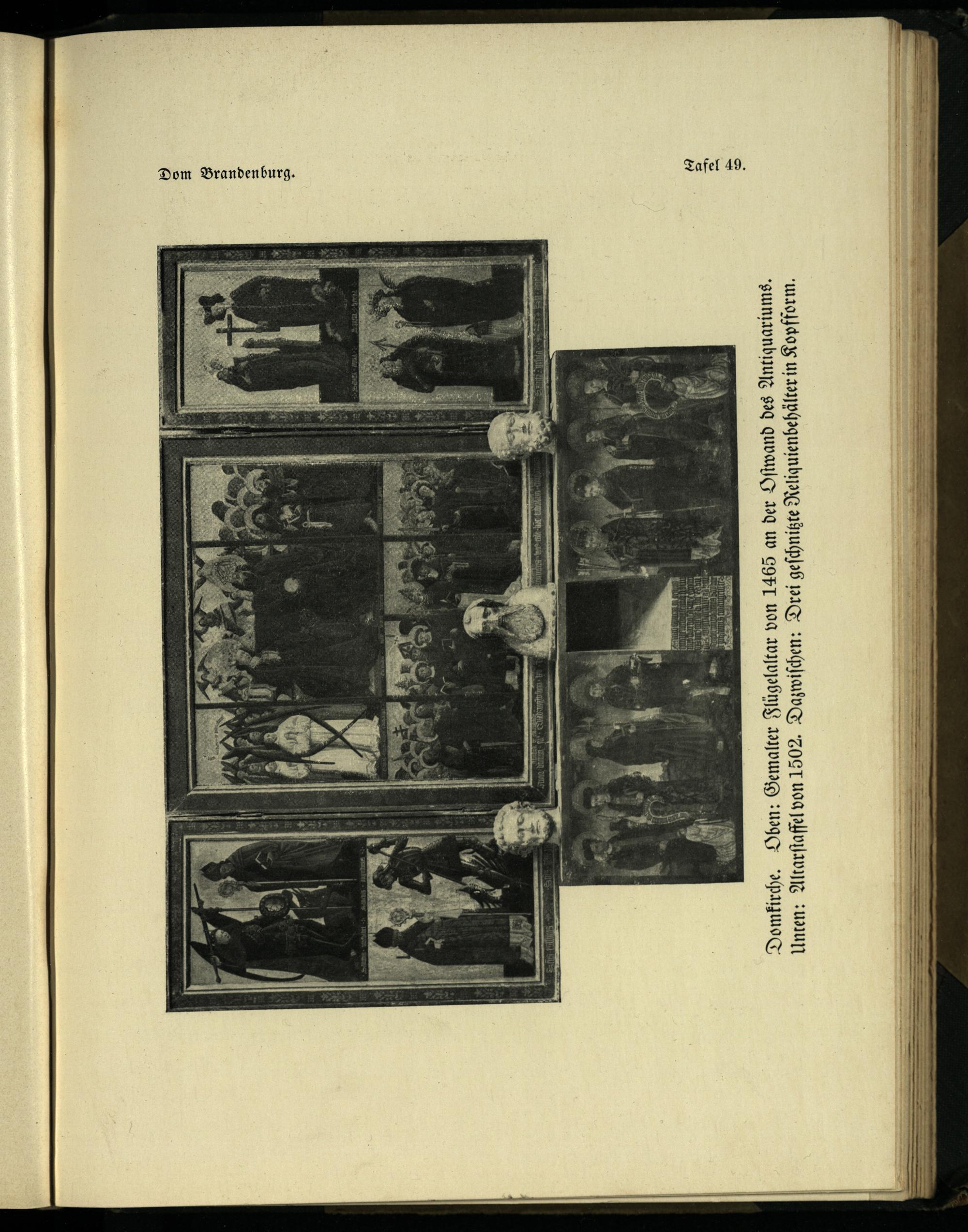 Domkirche. Oben: Gemalter Flügelaltar von 1465 an der Ostwand des Antiquariums. Unten: Altarstaffel von 1502. Dazwischen: Drei geschnitte Reliquienbehälter in Kopfform.