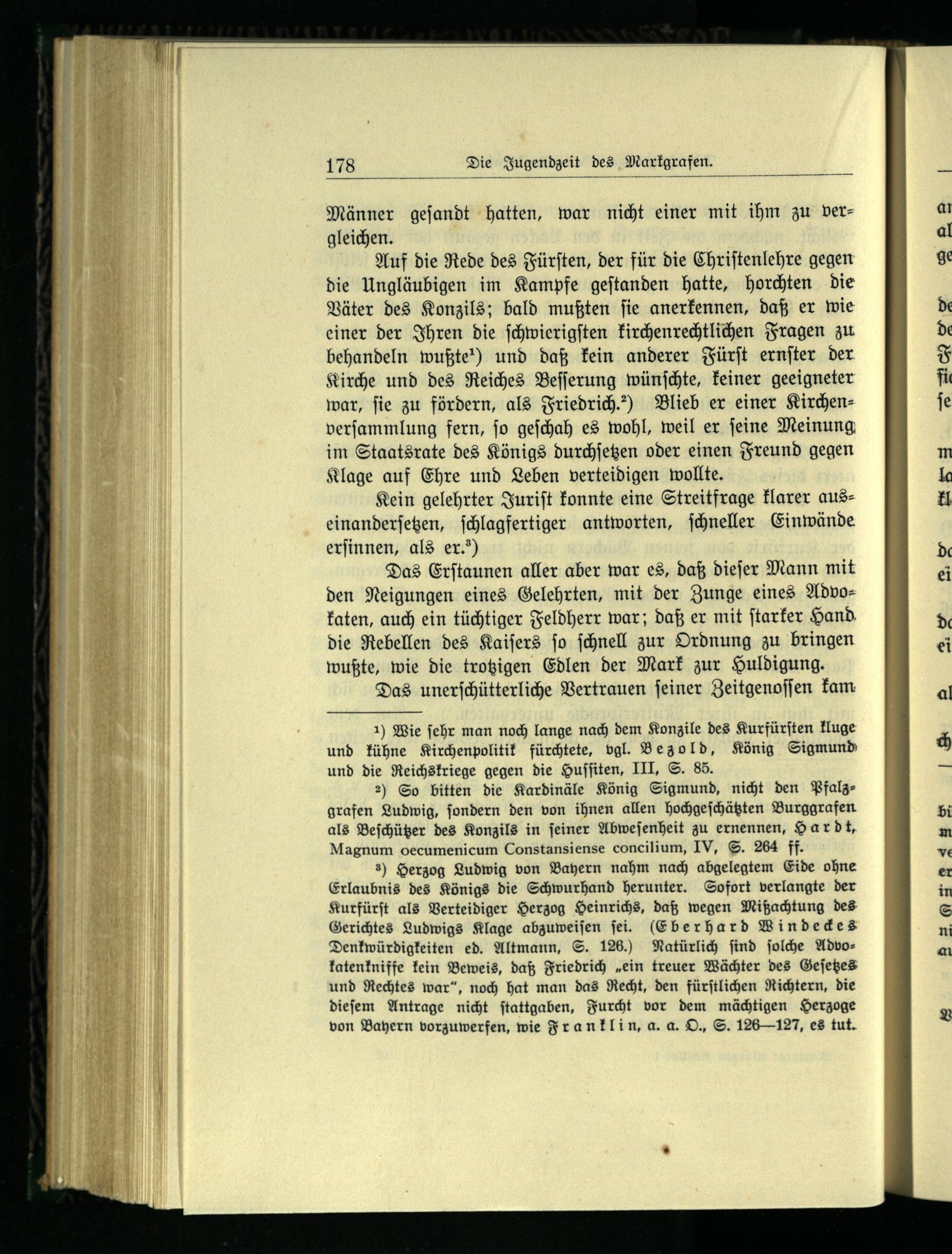 2) So bitten die Kardinäle König Sigmund, nicht den Pfalsgrafen Ludwig, ſondern den von ihnen allen hochgeſchätzten Burggrafen als Beſchützer des Konzils in ſeiner Abweſenheit zu ernennen, Hardt, Magnum oecumenicum Constansiense concilium, IV, S. 264 ff.