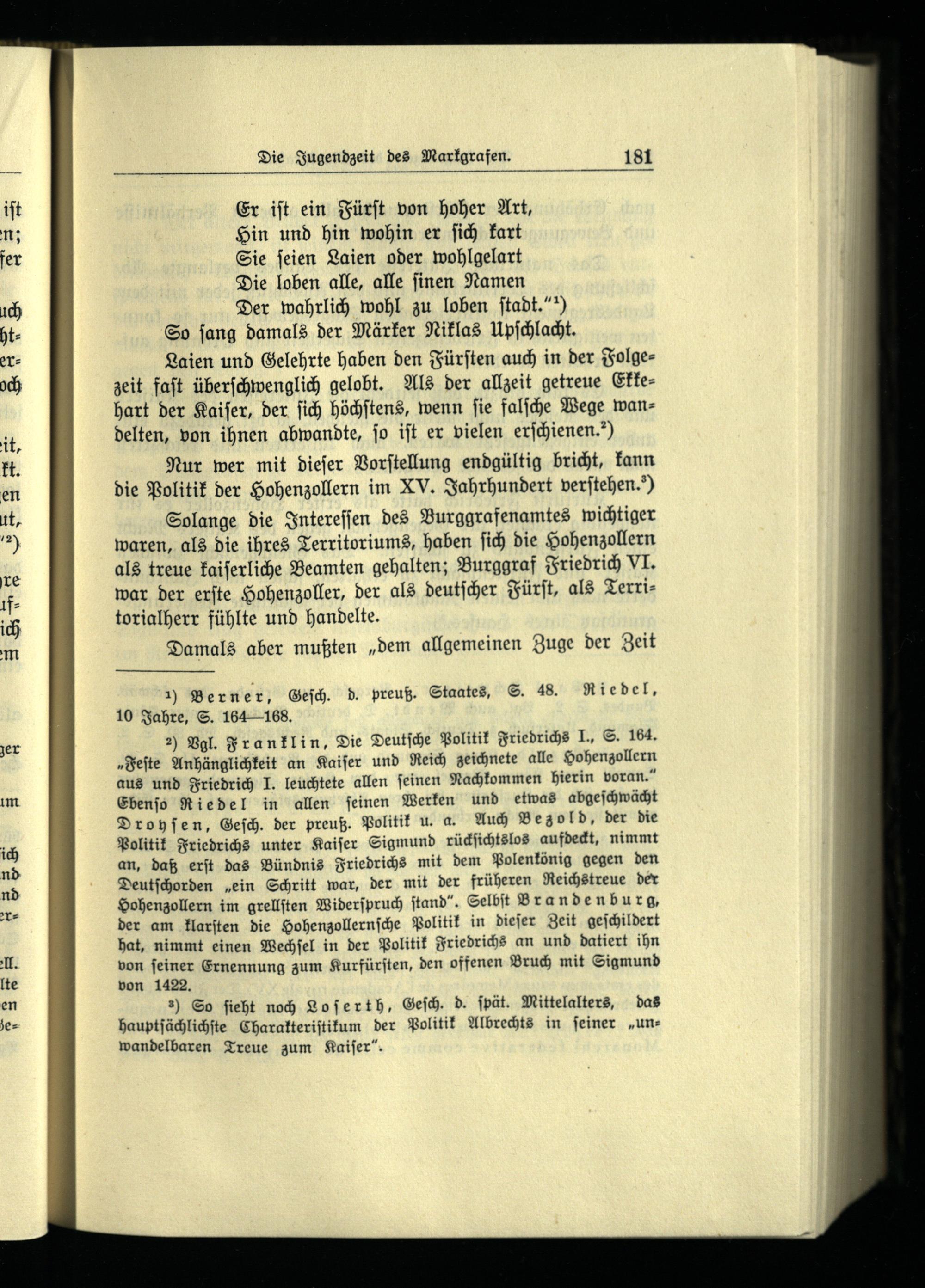 2) Val. Franklin, Die Deutſche Politik Friedrichs I., S. 164. „Feſte Anhänglichkeit an Kaiſer und Reich zeichnete alle Hohenzollern aus und Friedrich I. leuchtete allen ſeinen Nachkommen hierin voran.“ Ebenſo Riedel in allen ſeinen Werken und etwas abgeſchwächt Droyſen , Geſch. der preuß. Politik u. a. Auch Bezold, der die Politik Friedrichs unter Kaiſer Sigmund rückſichtslos aufdeckt, nimmt an, daß erſt das Bündnis Friedrichs mit dem Polenkönig gegen den Deutſchorden„ein Schritt war, der mit der früheren Reichstreue der Hohenzollern im grellſten Widerſpruch ſtand“. Selbſt Brandenburg , der am klarſten die Hohenzollernſche Politik in dieſer Zeit geſchildert hat, nimmt einen Wechſel in der Politik Friedrichs an und datiert ihn von ſeiner Ernennung zum Kurfürſten, den offenen Bruch mit Sigmund von 1422.