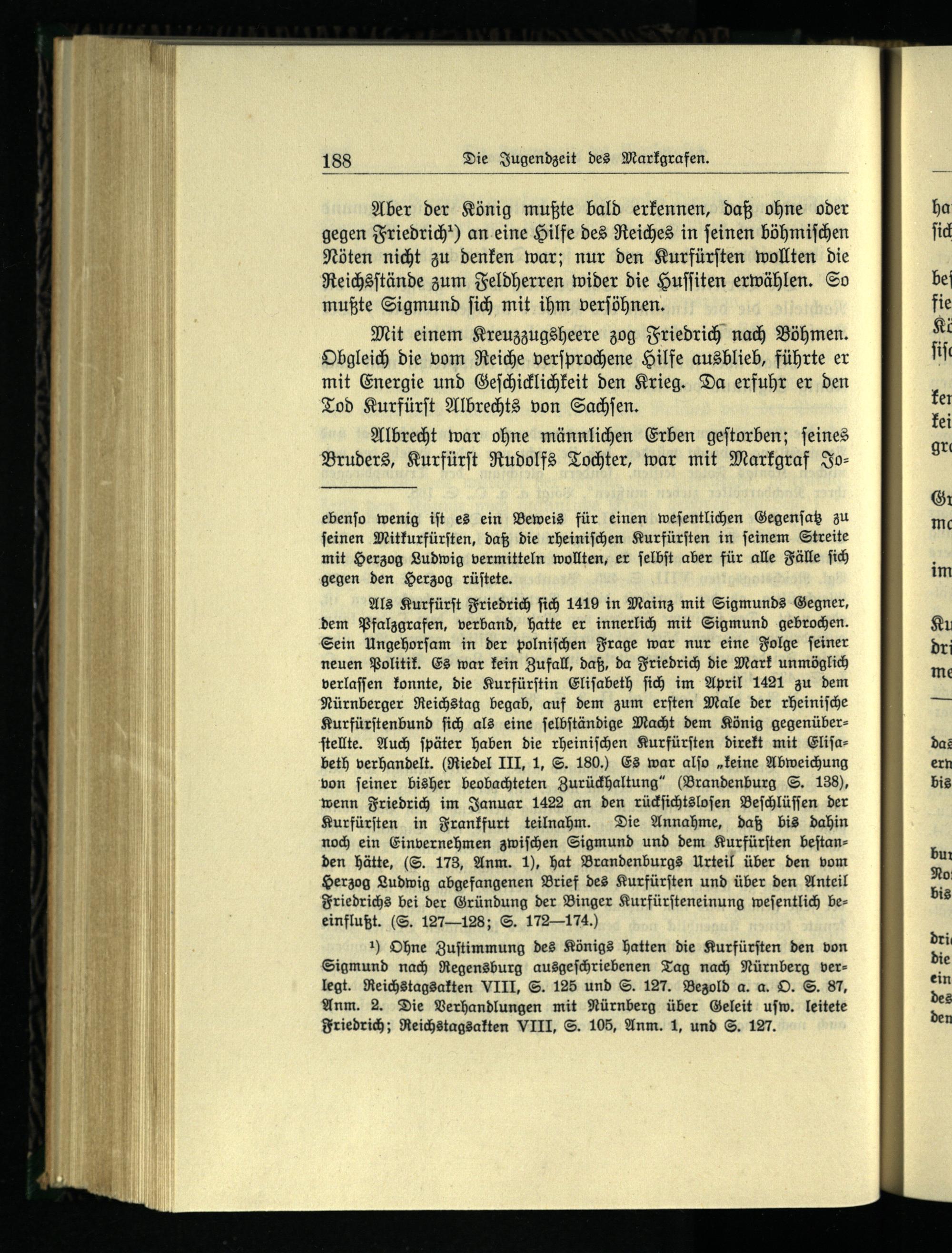 Als Kurfürſt Friedrich ſich 1419 in Mainz mit Sigmunds Gegner, dem Pfalzgrafen , verband, hatte er innerlich mit Sigmund gebrochen. Sein Ungehorſam in der polniſchen Frage war nur eine Folge ſeiner neuen Politik. Es war kein Zufall, daß, da Friedrich die Mark unmöglich verlaſſen konnte, die Kurfürſtin Eliſabeth ſich im April 1421 zu dem Nürnberger Reichstag begab, auf dem zum erſten Male der rheiniſche Kurfürſtenbund ſich als eine ſelbſtändige Macht dem König gegenüberſtellte. Auch ſpäter haben die rheiniſchen Kurfürſten direkt mit Eliſabeth verhandelt.(Riedel III, 1, S. 180.) Es war alſo„keine Abweichung von ſeiner bisher beobachteten Zurückhaltung“(Brandenburg S. 138), wenn Friedrich im Januar 1422 an den rückſichtsloſen Beſchlüſſen der Kurfürſten in Frankfurt teilnahm. Die Annahme, daß bis dahin noch ein Einvernehmen zwiſchen Sigmund und dem Kurfürſten beſtanden hätte,(S. 173, Anm. 1), hat Brandenburgs Urteil über den vom Herzog Ludwig abgefangenen Brief des Kurfürſten und über den Anteil Friedrichs bei der Gründung der Binger Kurfürſteneinung weſentlich beeinflußt.(S. 127—128; S. 172—174.)
